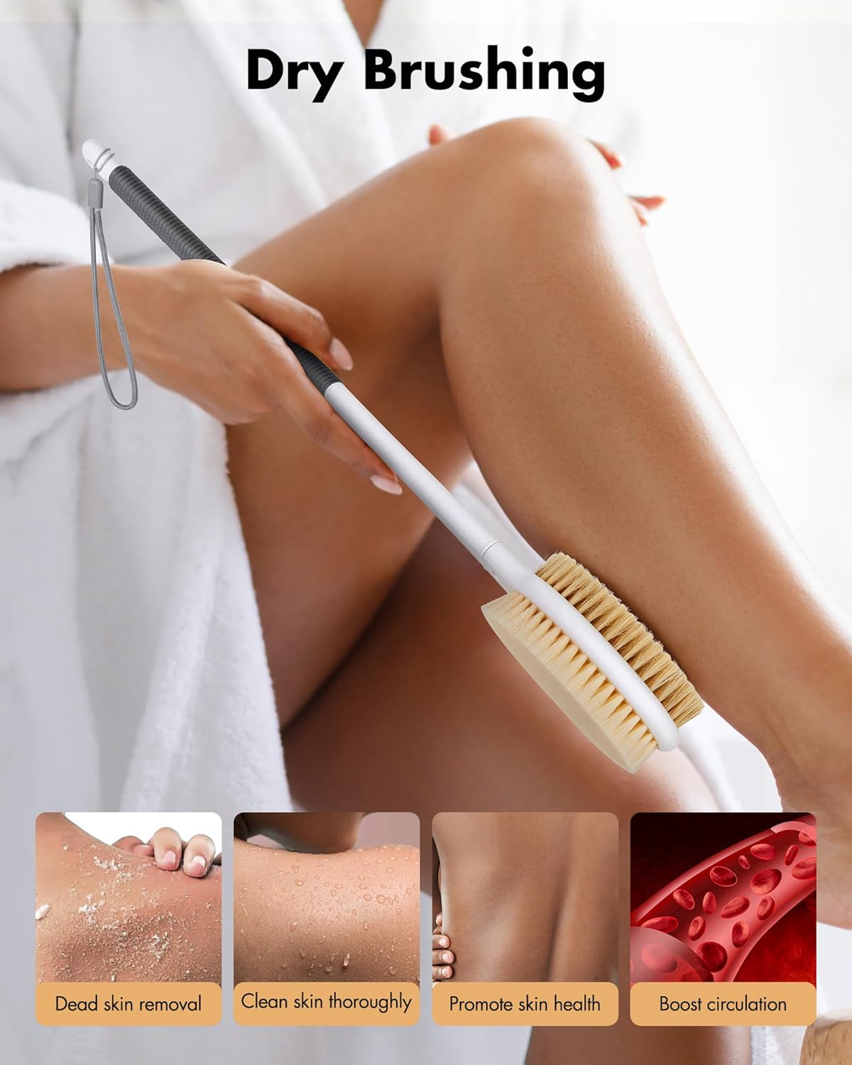 - Dry Brushing Function: The long handle bath brush has a dry brushing function, which can effectively clean pores, exfoliate, remove dirt, dead skin, excess oil and pore residue. It can promote blood circulation and make the skin healthier