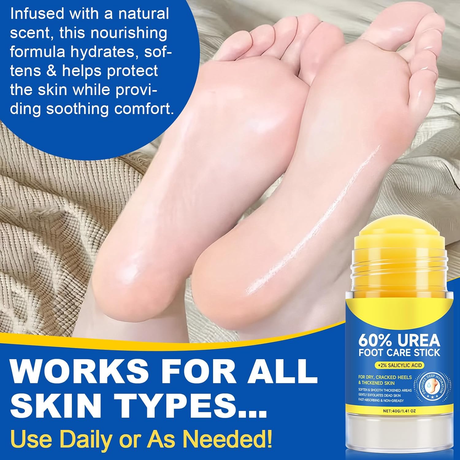 - ăFast Relief for Deep Cracks & Callusesă60% Urea + 2% Salicylic Acid works like a âhydration drillâ to soften stubborn calluses and cracked heels from day one. The maximum strength urea cream stick melts into thick skin layers on feet, elbows, and knees, smoothing rough patches and sealing cracks. Apply daily â feel the difference in 3 days without socks catching on dry skin!