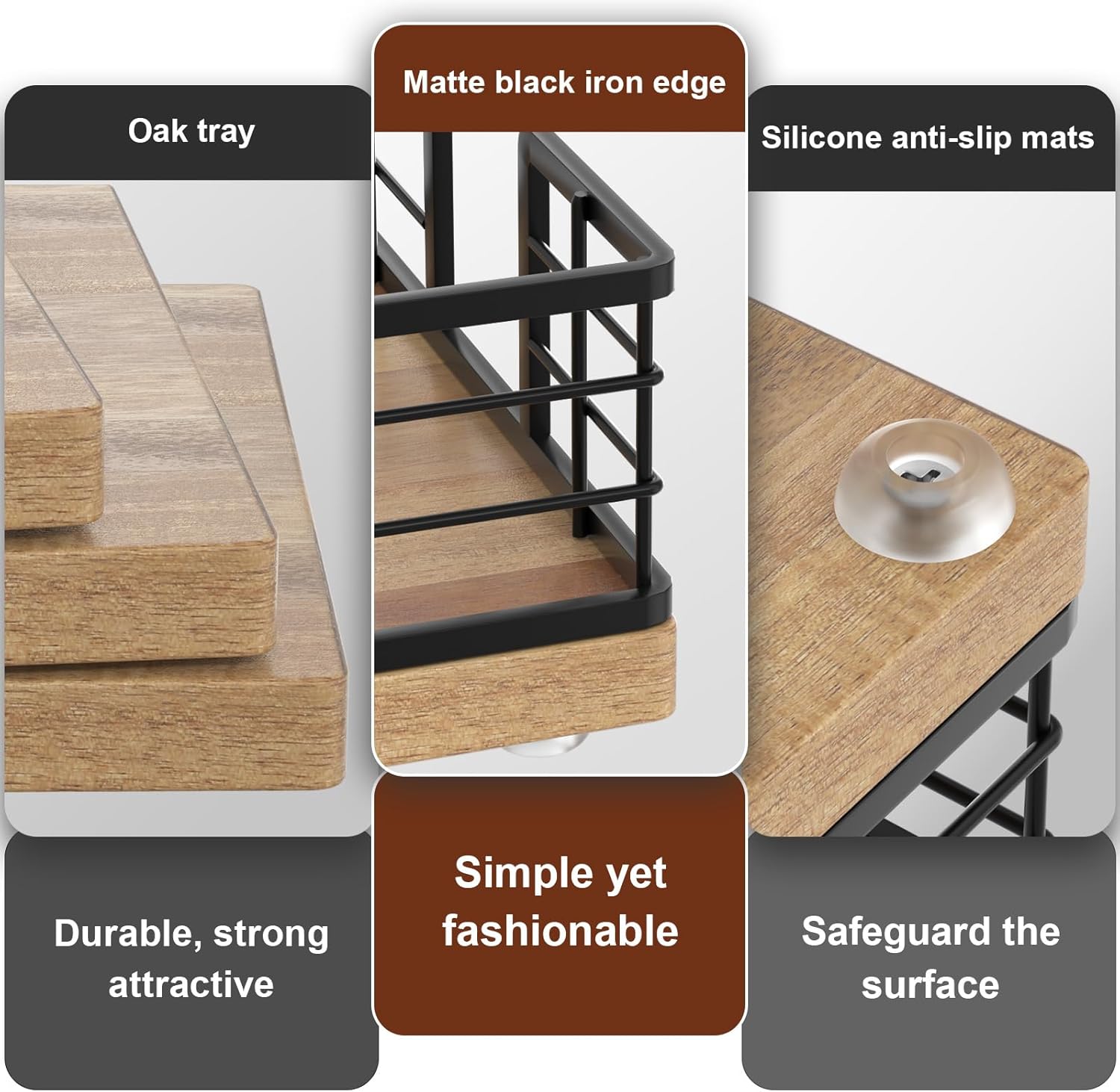 - Cost-effective: No assembly required, easy to clean. The tray crafted from iron and Acacia is simple and attractive. The solid bottom ensures items won't fall. With silicone non-slip pads, it provides both anti-slip functionality and better protection for surfaces