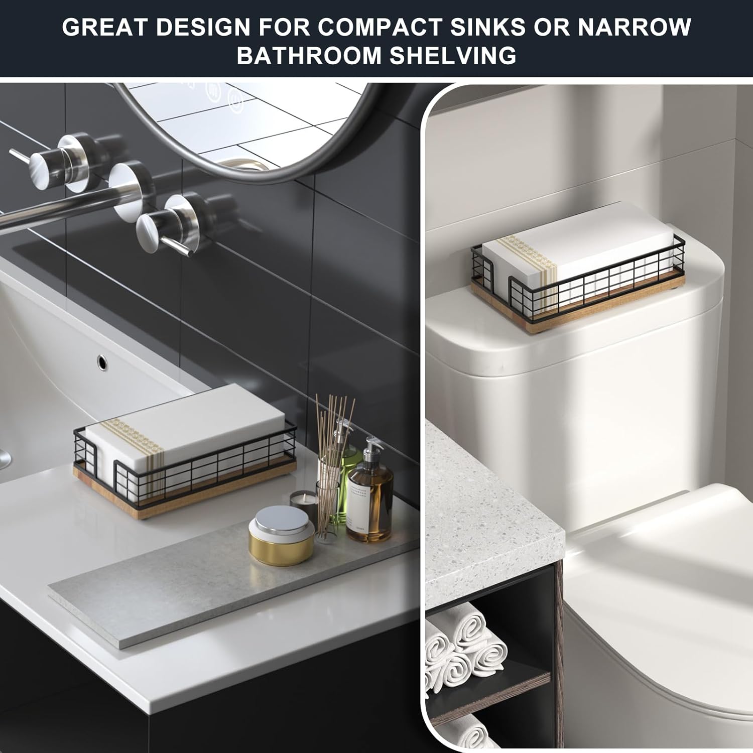 Wican Guest Towel Holder Tray for Bathroom, Acacia and Iron Napkins Holder for Powder Room Dinning Table Wooden Basket for Disposable Paper Hand Towels Black and Acacia