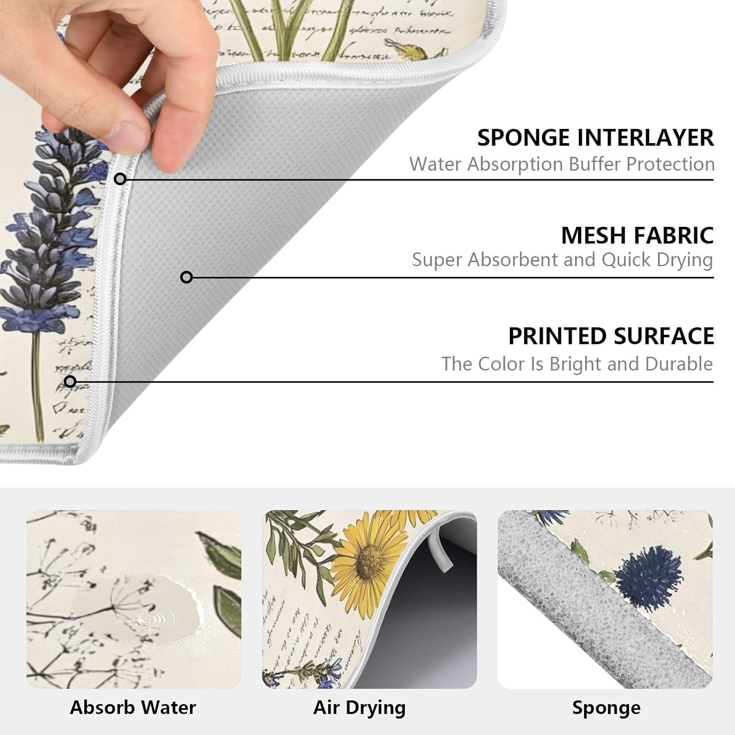 Page Wildflower Vintage Dish Drying Mats for Kitchen Counter, 18x24 inch Drying Dishes Absorbent Microfiber Dish Drainer Mat Rack Pad Fast Dry