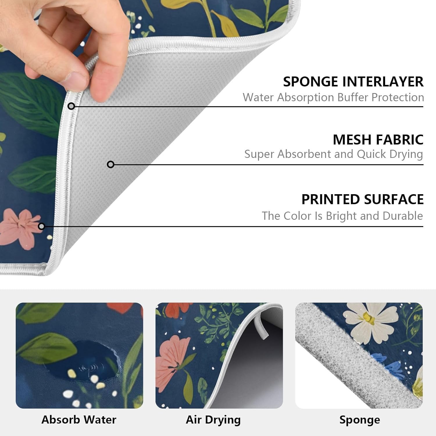 Wildflowers Dark Blue Dish Drying Mats for Kitchen Counter, 18x24 inch Drying Dishes Absorbent Microfiber Dish Drainer Mat Rack Pad Fast Dry