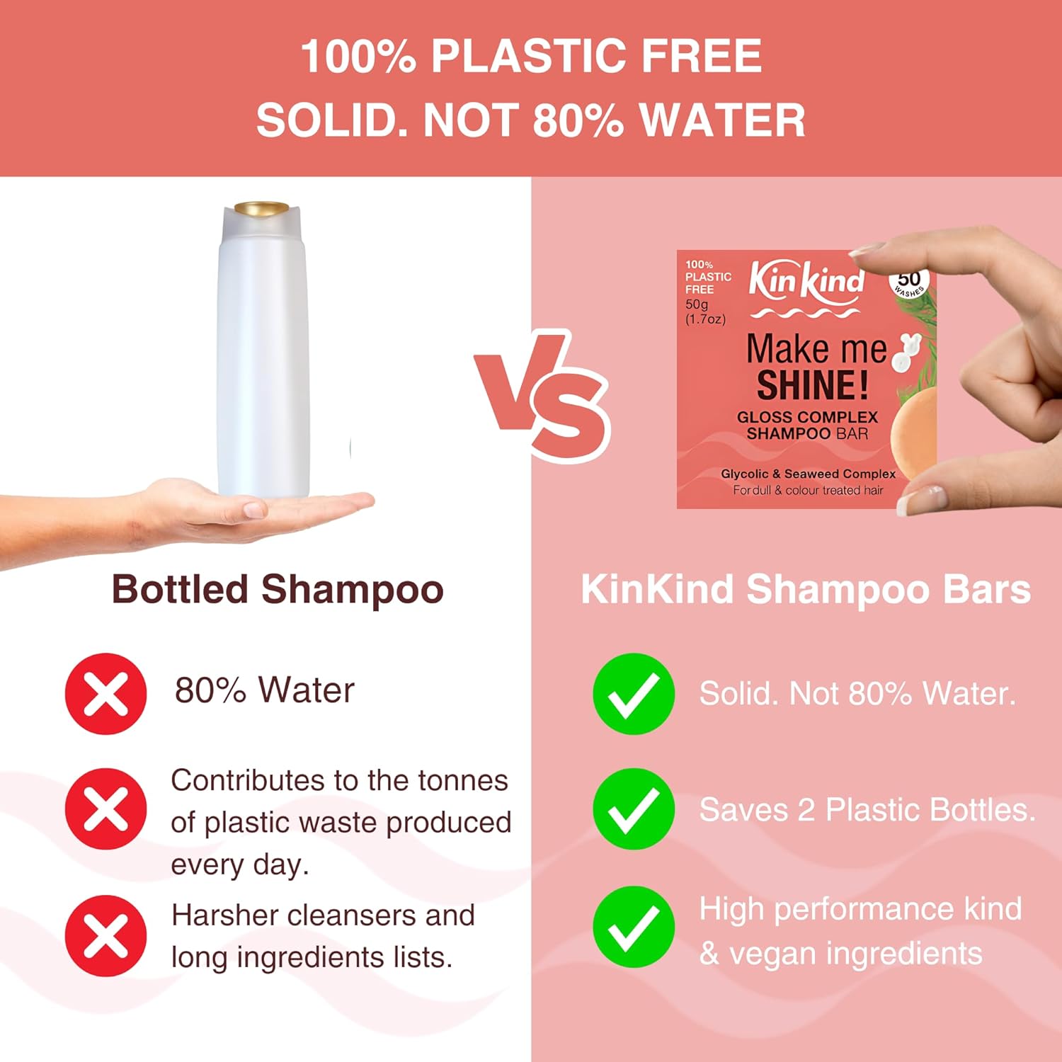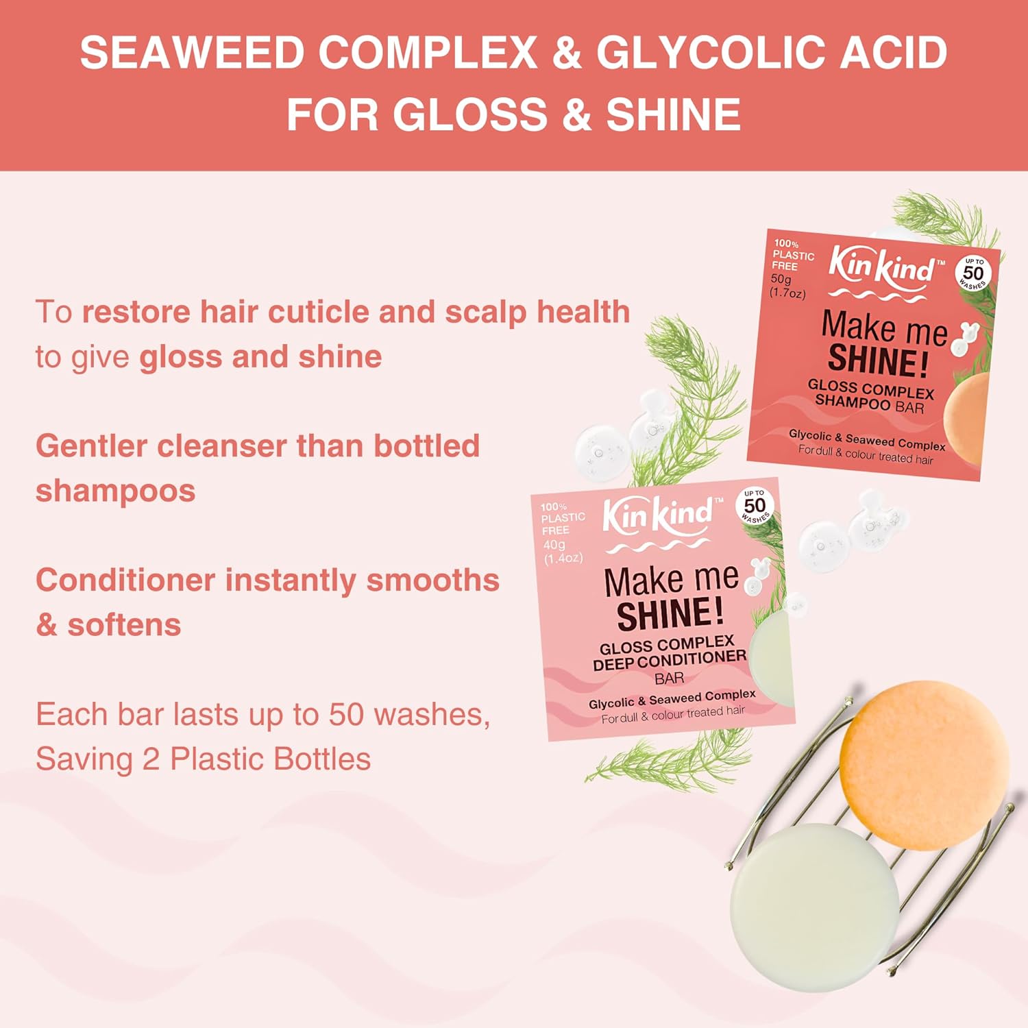 KinKind Hair Gloss Shampoo and Conditioner Bar Set. Make me SHINE! Glycolic Acid & Seaweed Shampoo Bar and Conditioner with Glycolic Gloss Complex for Dull & Coloured Hair. Vegan, UK made