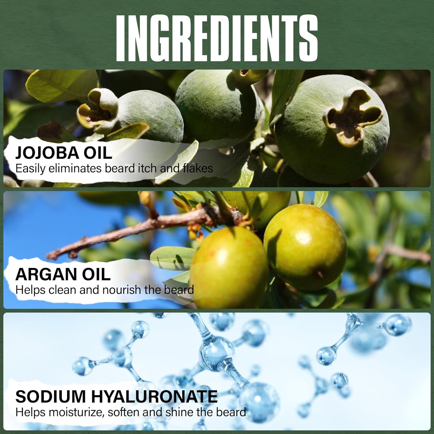 - TAMING YOUR BEARD: Argan oil, jojoba oil and sodium hyaluronate deeply cleanse and nourish your beard. The blend of moisturizing formulas minimizes irritation while helping to tame your coarse, hard, dry beard, leaving you with a soft, smooth beard that won't feel heavy or greasy. Easy to style.