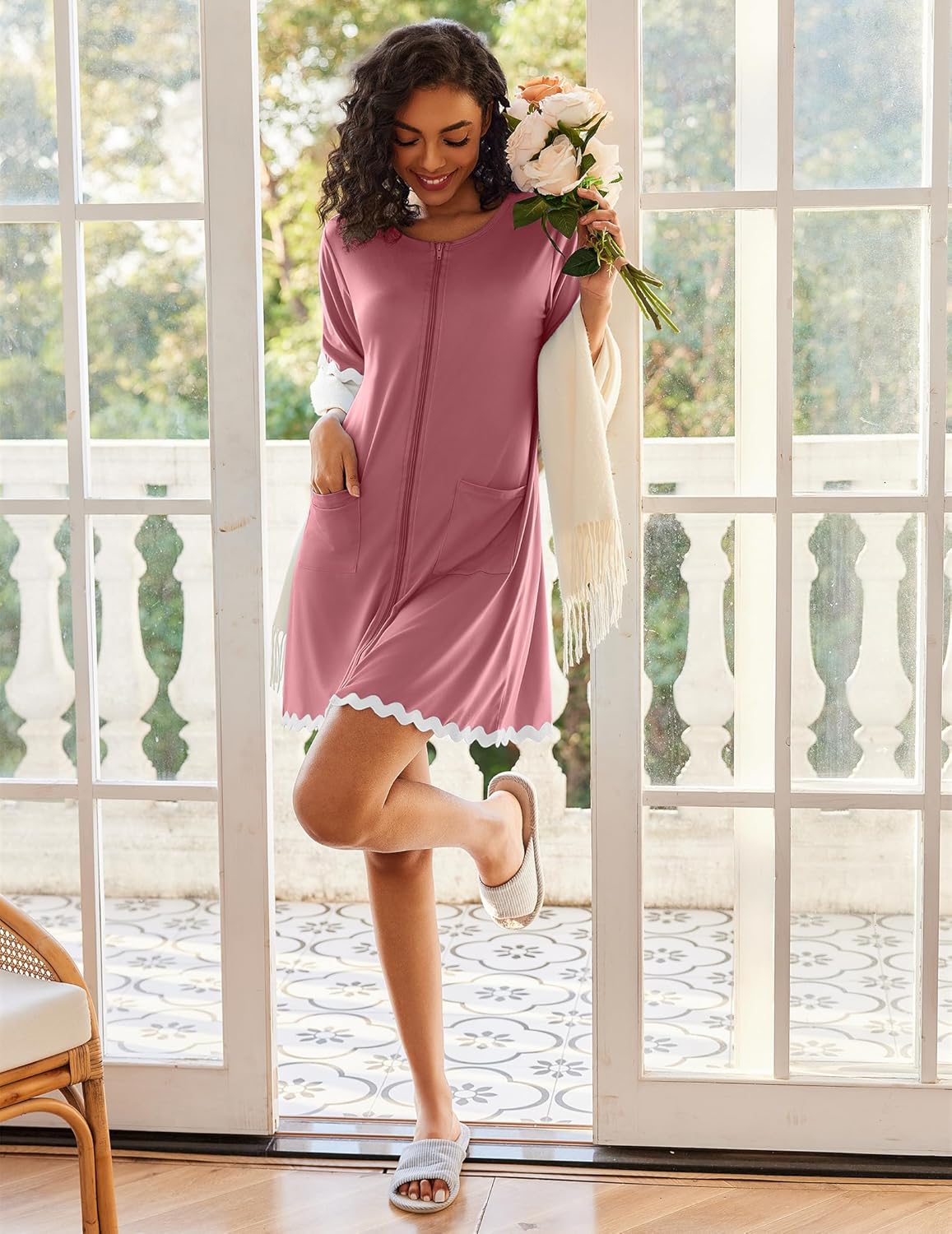 Ekouaer Women Zip Up Robe Lightweight Housecoats with Pockets Knee Length Short Bathrobes Soft Nightgown S-3XL