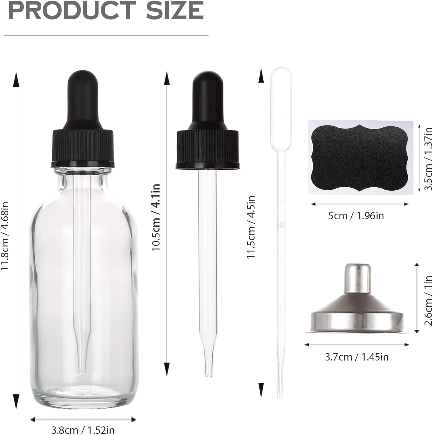 - Package Includes:4 pack 2oz (60ml) transparent glass dropper bottles + 1 stainless steel funnels + 1 long dropper + 4 labels.