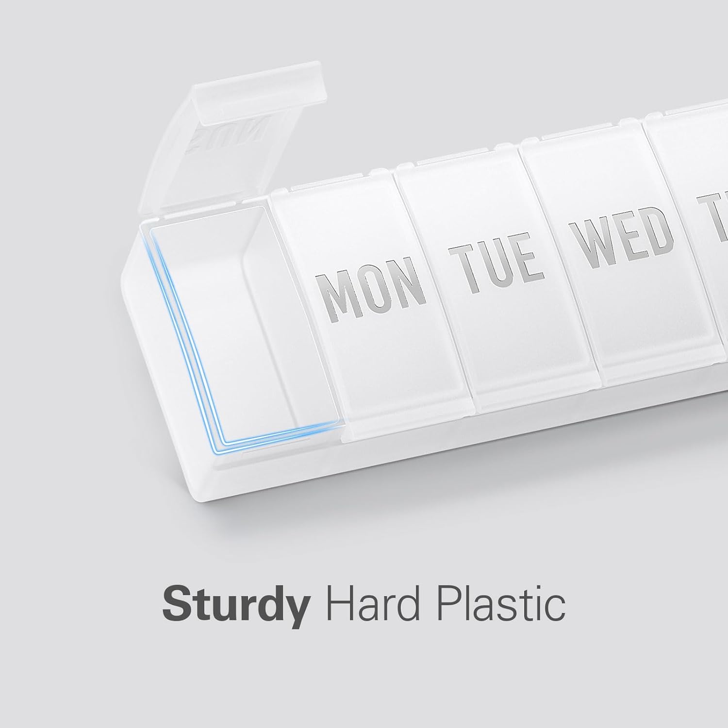 - Unique Frosted Surface: Effectively prevents scratches or fingerprints on the daily pill organizer. The 7-days vitamin pill box is light protected and also helps keep pills' privacy.