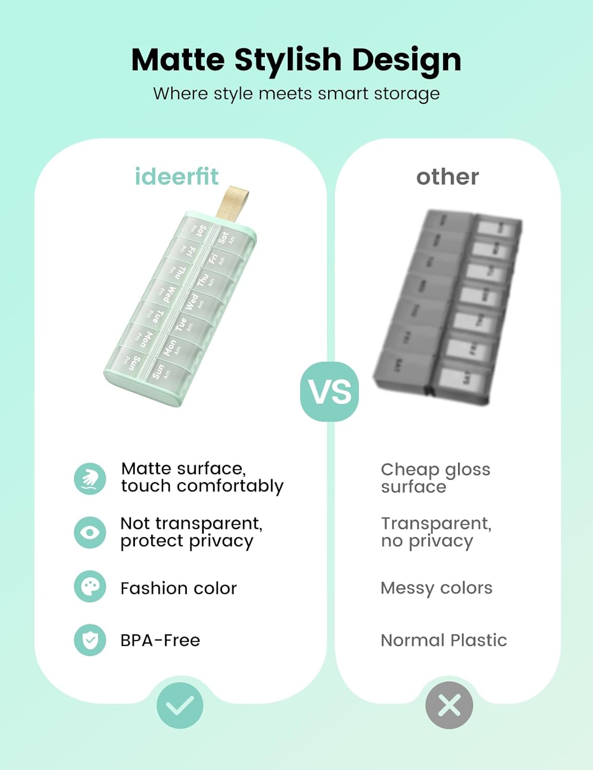 - 【Matte Privacy Design】 Crafted with a subtle matte finish, this pill case offers a modern look and opaque cover for discretion. The surface resists fingerprints, feels comfortable, and enhances the style of your weekly pill organizer.