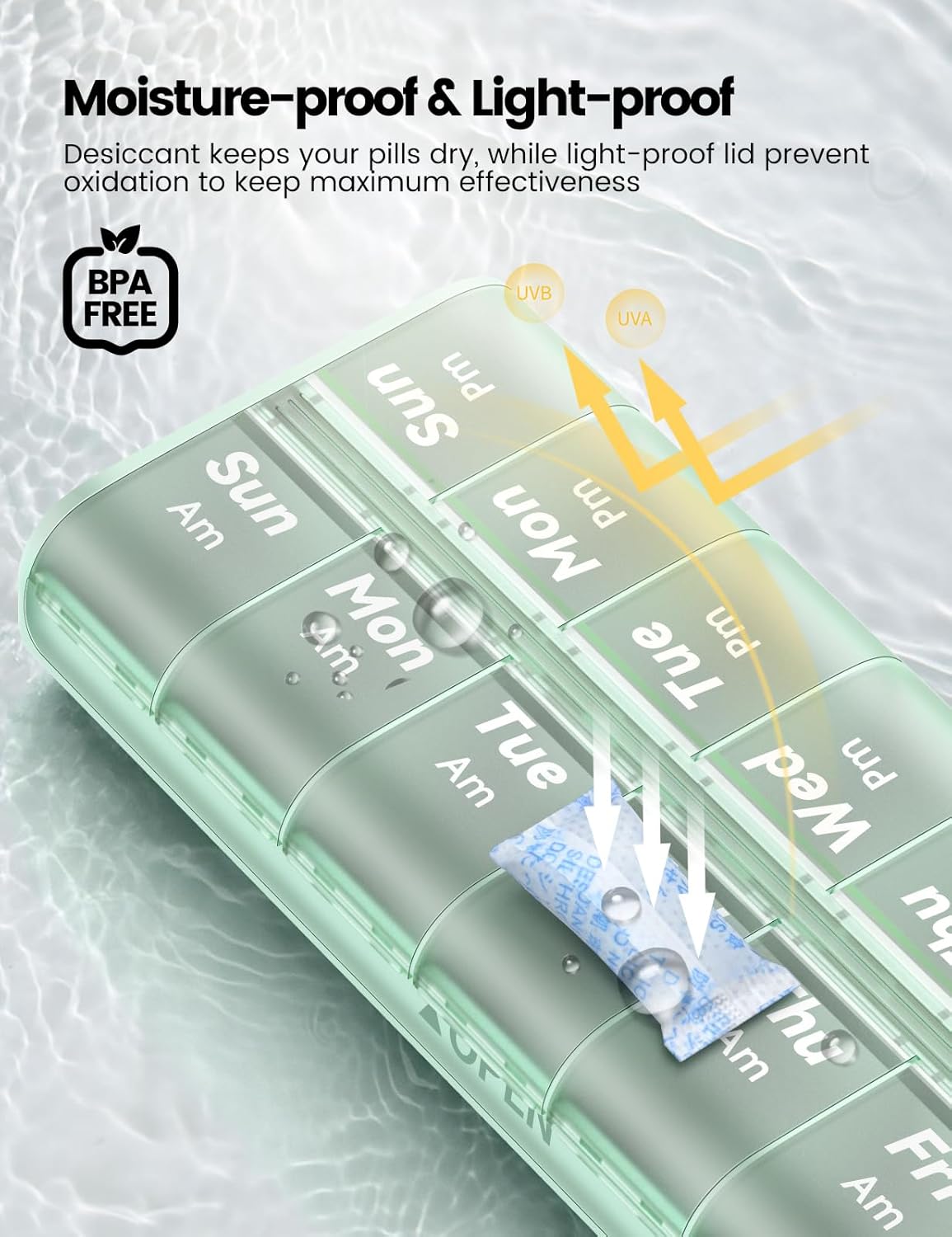 - 【Moisture-Proof & Light Protection】 An independent desiccant compartment and opaque lids keep tablets dry and shielded from light. This moisture-proof pill organizer preserves pill freshness and potency throughout your weekly routine.