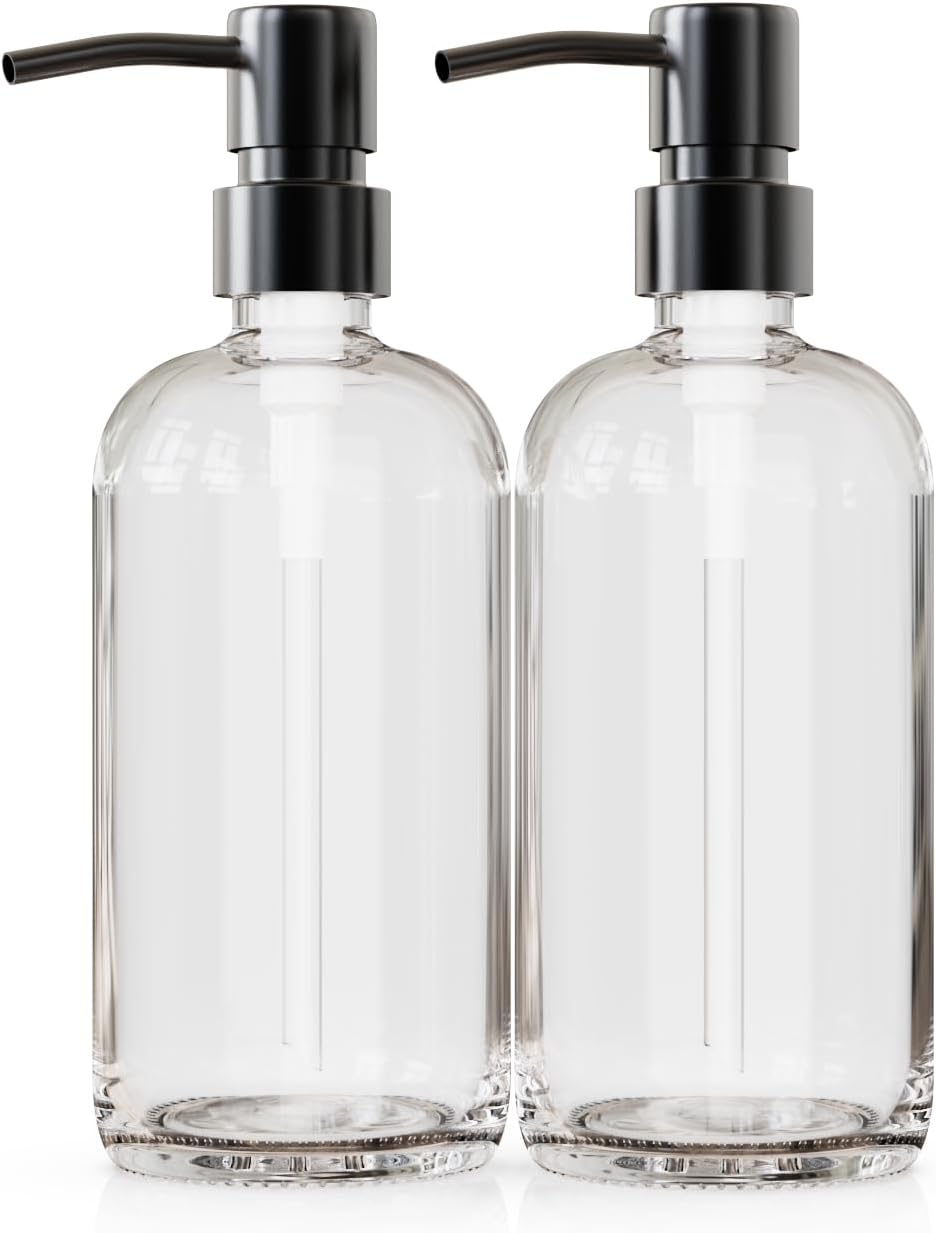 - This Pack Includes: 2 Pcs 16 Oz/480ml clear glass soap dispenser with pump, the liquid dispenser is refillable and versatile. Hand and Dish soap dispensers with a black stainless steel pump, fit for bathroom and kitchen.
