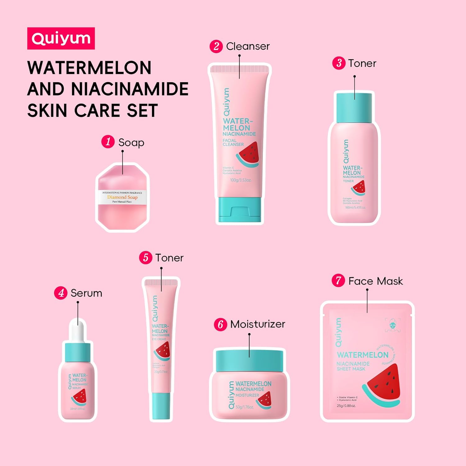 - Freshing Skincare Routine - Discover your new skincare essentials with the QUIYUM Care Skincare Set. This 7-in-1 set includes Watermelon Serum 1.01 fl oz, Cleanser 3.53 oz, Toner 5.41 fl oz, Handmade soap 100g, 2 Pieces Facial Masks, Eye Cream 0.71oz and Moisturizing Face Cream 1.76 oz. Refreshing skin care without stickiness