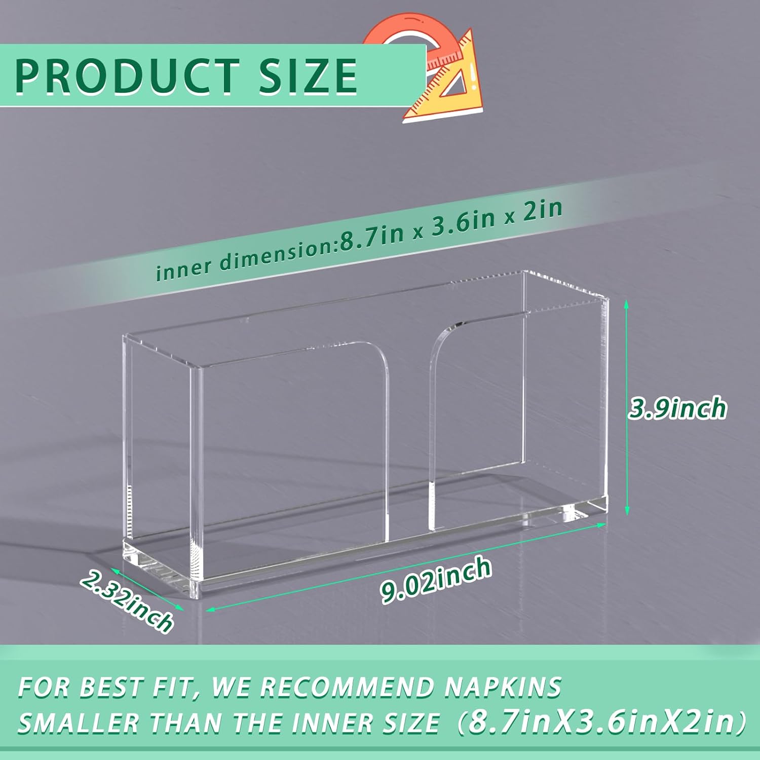 - 【 Fits Most Standard-Sized Napkins 】Inner dimension of [8.7 ] inches, this upright napkin organizer accommodates most napkins, including cocktail napkins, luncheon napkins and guest towels. Perfect for keeping your facial tissues, dinner napkins, or party napkins neatly stored and within reach