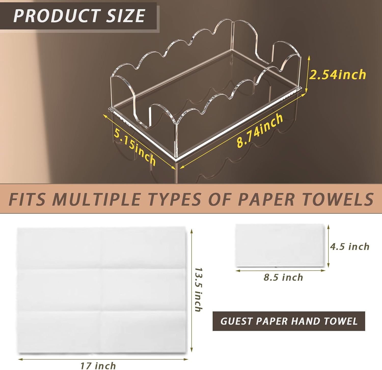 - 【 NAPKIN HOLDER SIZE】Our Acrylic napkin holder upgraded Improved size is 8.9” x 5.2” x 2.5”, inner size 8.3*4.7 inch, suitable for folded size smaller than 8.3*4.7 inch disposable paper hand towels placed in bathroom,kitchen,living room,party,dinner table or any occasion