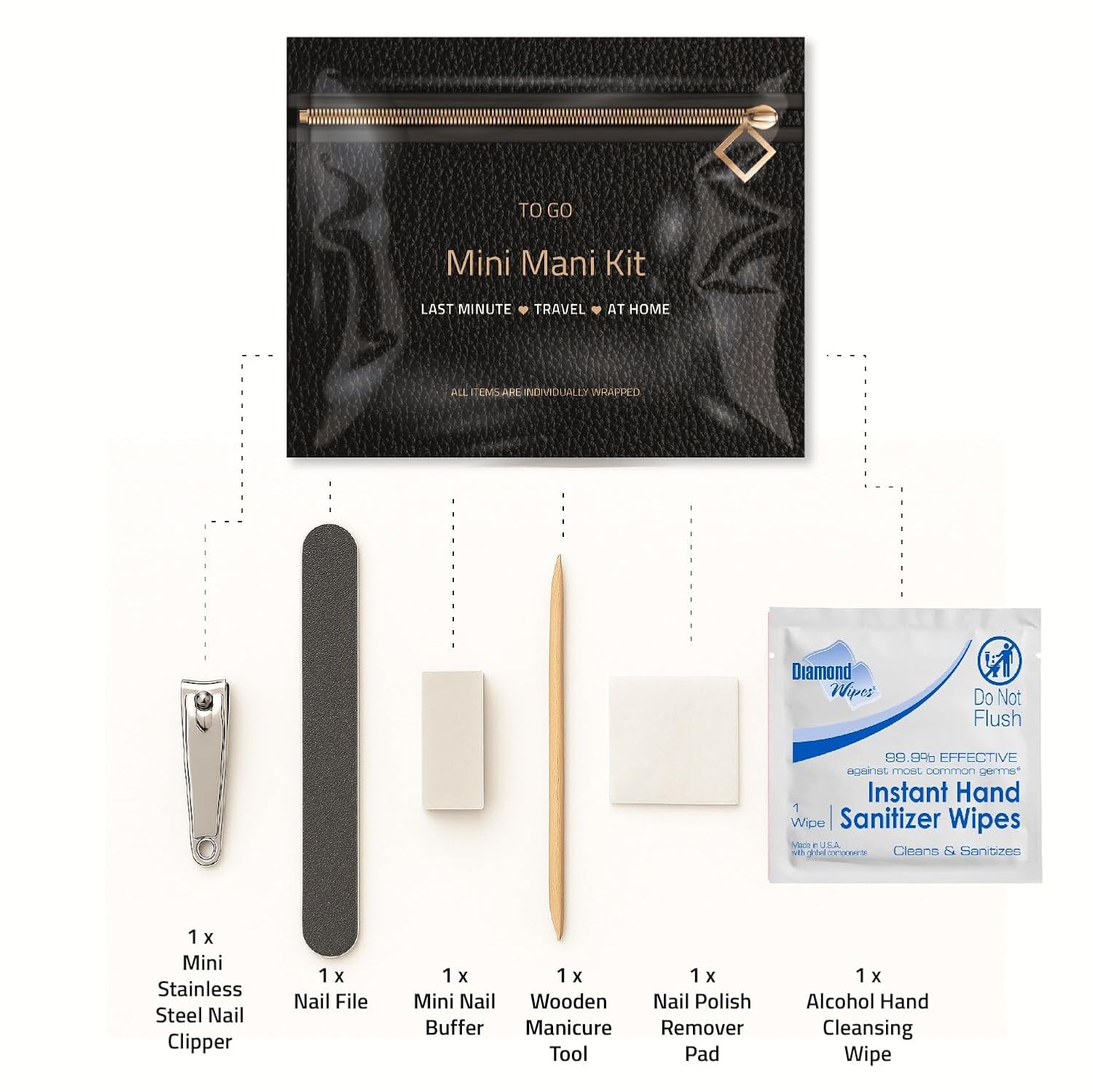 Mini Mani Kit – Disposable Manicure Set with Nail Clipper, File, Buffer, Cuticle Stick & Polish Remover Pad – Compact One-Time Use Nail Care Kit for Travel, Purse, Desk, or Car (Black Purse)