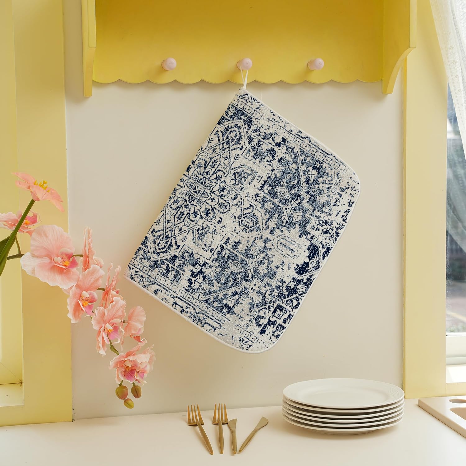 Blue Dish Drying Mat for Kitchen Counter, 18x24 Inch Blue White Boho Style Absorbent Dish Drying Pad Heat Resistant Mat Coffee Bar Mat Dish Drainer Rack Mat