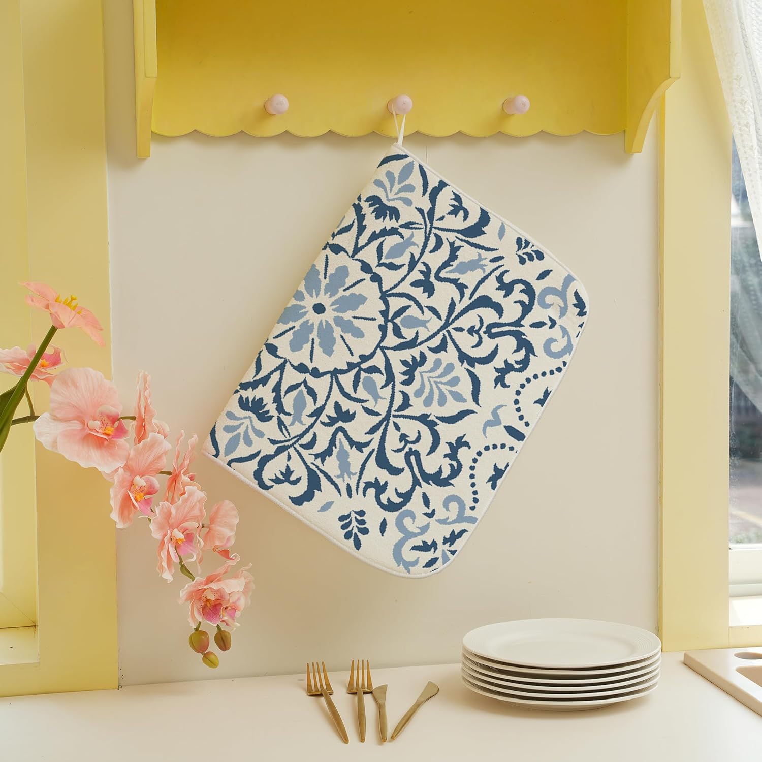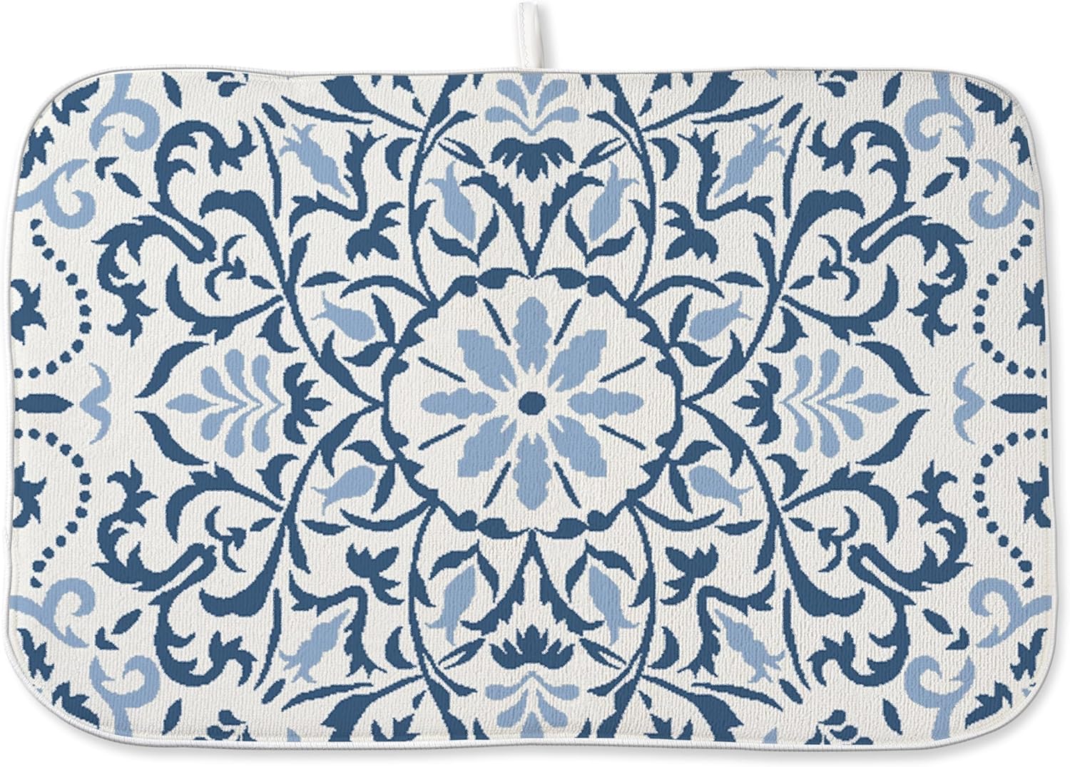 Blue Dish Drying Mat for Kitchen Counter, 18x24 Inch Navy Blue Boho Style Floral Absorbent Dish Drying Pad Heat Resistant Mat Coffee Bar Mat Dish Drainer Rack Mat