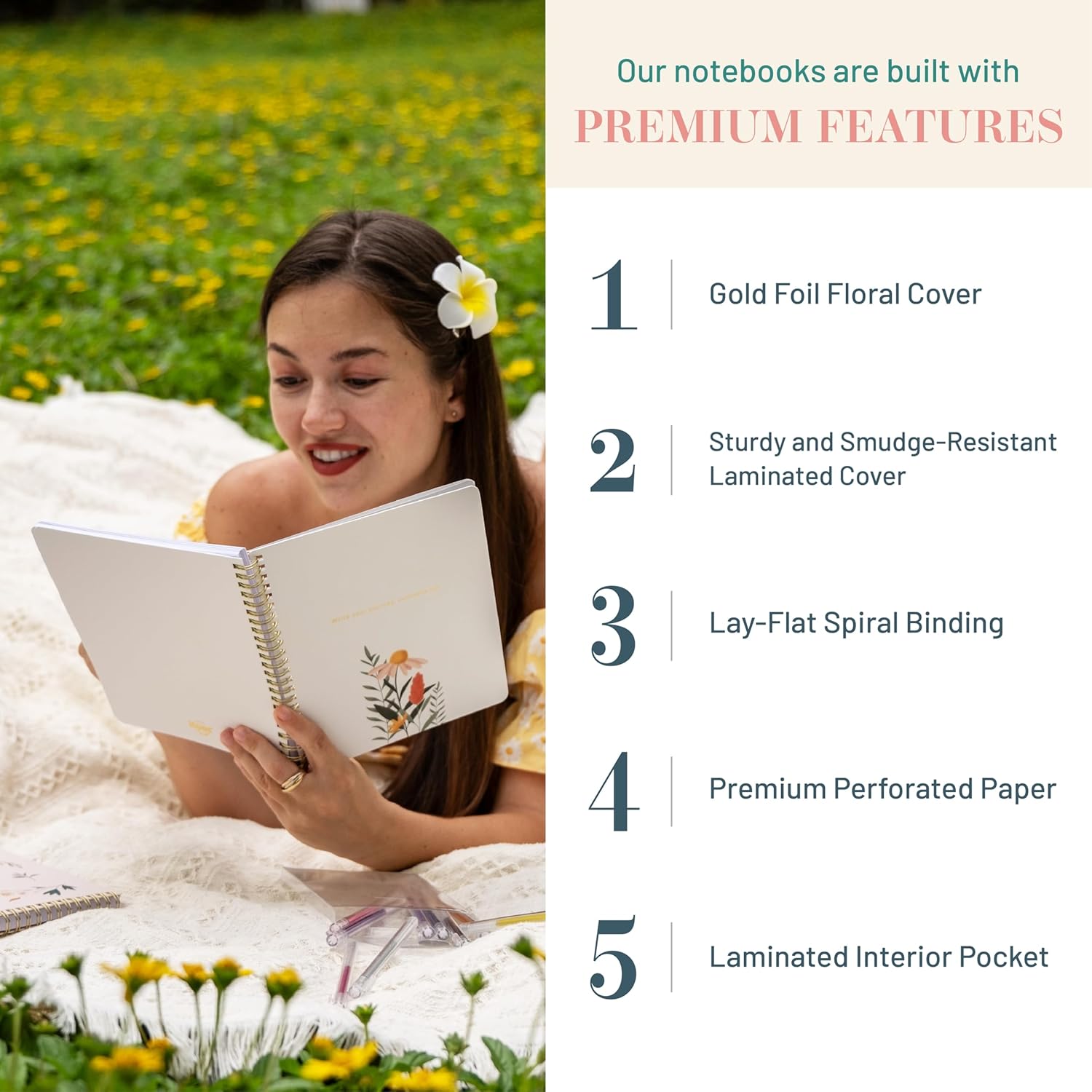 - Durable Stylish Cover: The durable spiral binding keeps pages secure while allowing our hard cover notebook to lay flat for smooth writing. Its pretty cover, combined with laminated interior pockets, adds style and functionality.