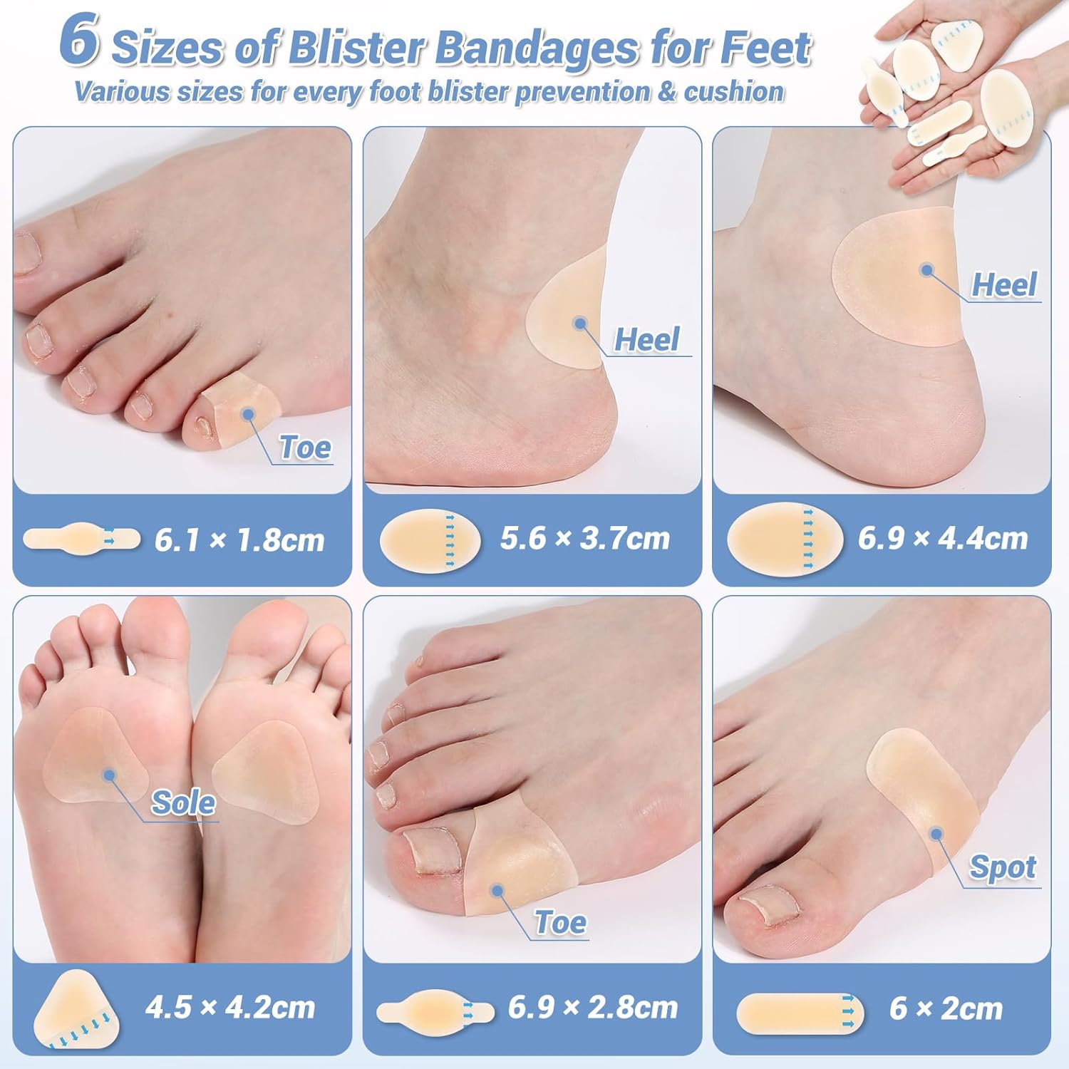 - 【Variety Pack Blister Pads for Feet】: You will get a pack of 64 pcs gel blister bandages for your feet, offering six different sizes for different parts of the body such as the heel, toe, feet, and fingers. Sufficient quantities to meet your daily foot care needs. Individually wrapped for easy portability, this foot heel blister bandages set is perfect for use anytime, anywhere