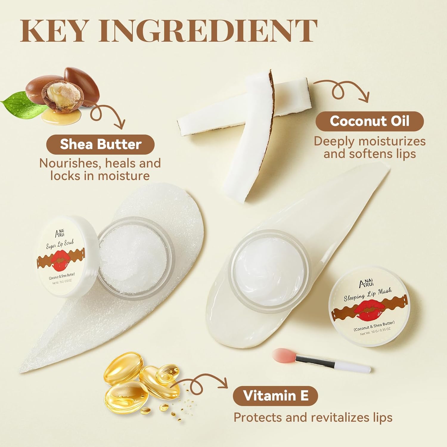 ANAI RUI Coconut Lip Scrub & Lip Mask Set with Shea Butter, Lip Scrubber Exfoliator Enriched with Vitamin E, Sugar Scrub for Dry Lips, Hydrating Lip Mask for Overnight Use, Christmas Gifts for teens