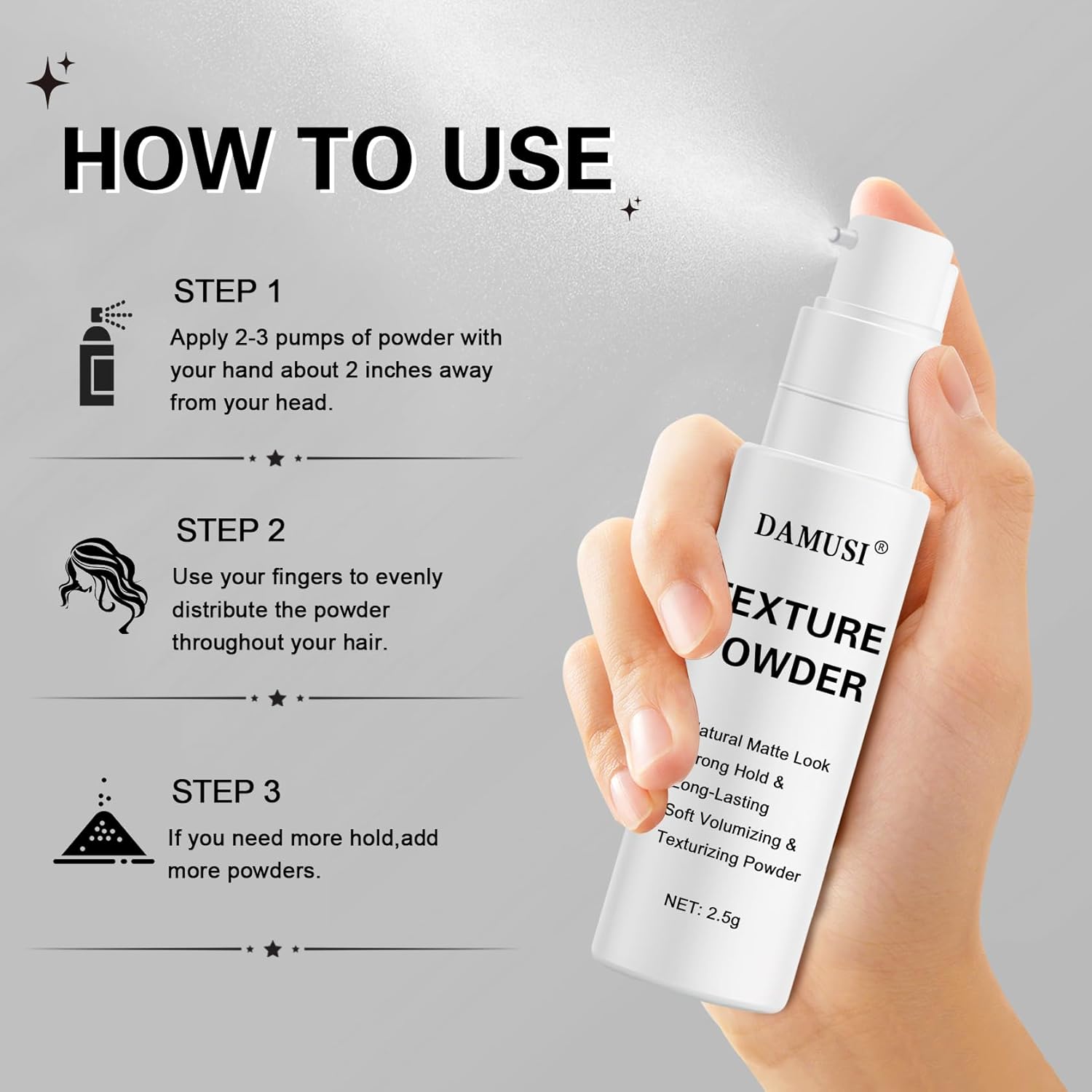 - NATURAL FINISH: Use volumizing texture powder to enhance the natural texture of hair, so that your hair can be easily created with perfect style and a natural matte effect. Hair styling powder is suitable for all hair types and any hair color, vegan and cruelty-free