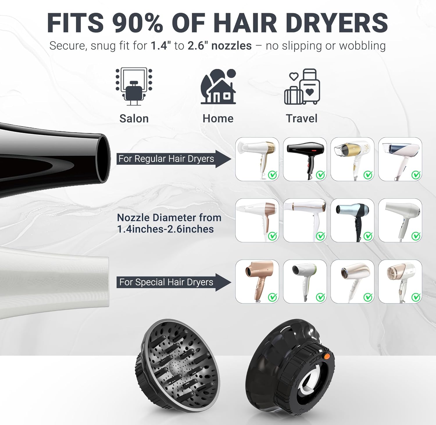 - 【Universal Fit】- Compatible with Most Hair Dryers. Works with Dyson, Shark, Conair, Babyliss & 90% of blow dryers (fits 58mm/2.3" or smaller nozzles). Flexible silicone adapter ensures a secure, non-slip fit—no more frustrating attachment falls!