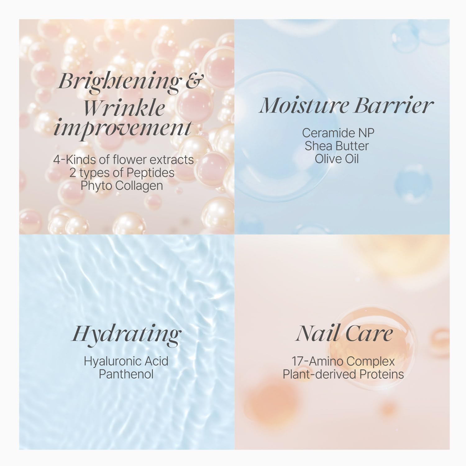 - Silky & Smooth Hands: Our rich cream, infused with extracts from four different flowers, two types of peptides, and phyto collagen, which are effective in skin repair, works to enhance skin elasticity, leaving your hands hydrated and silky.