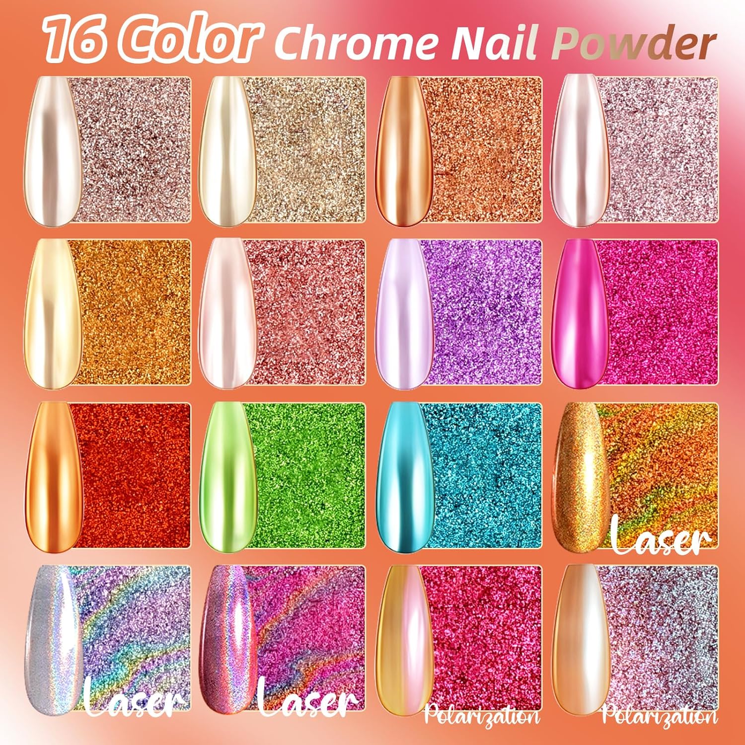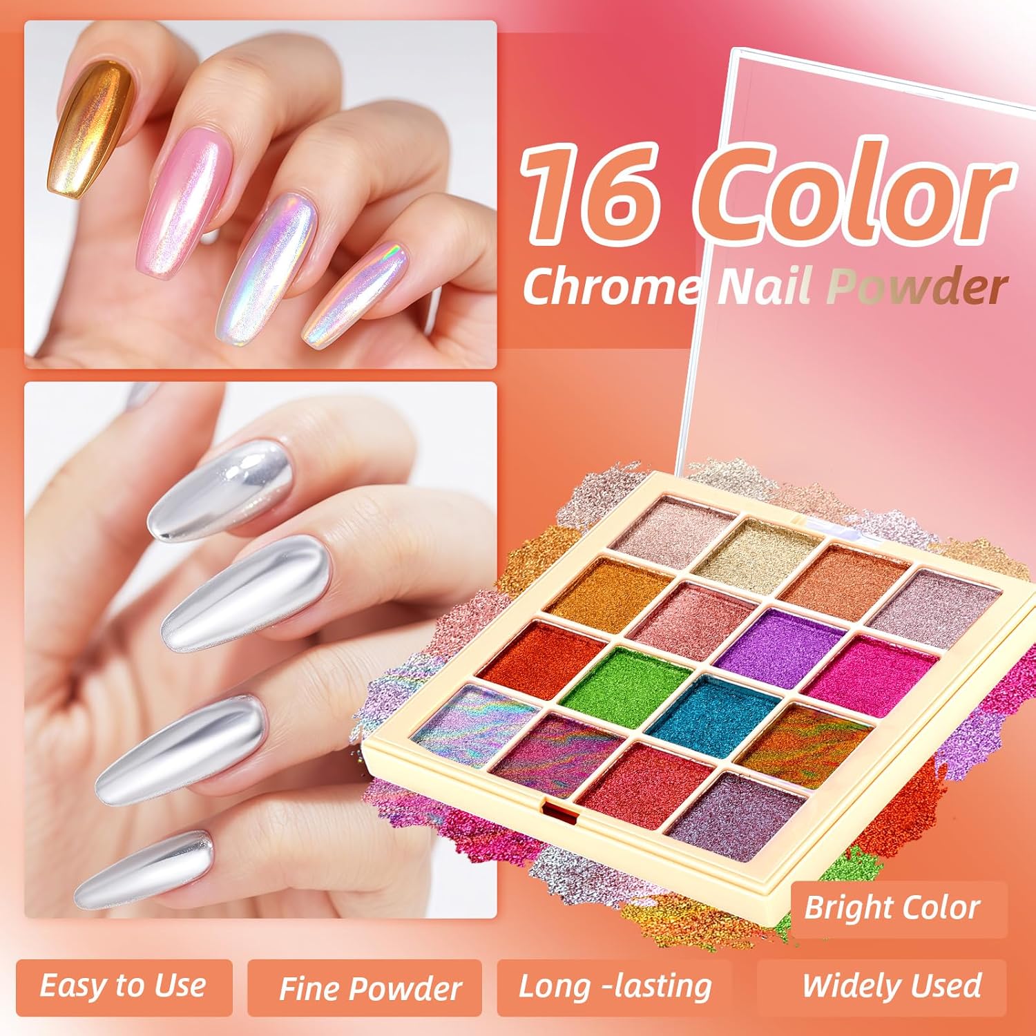 Chrome Nail Powder Palette, 16 Glitter Laser Metal Mirror Effect Aurora Iridescent Holographic Gold Silver Bright Colors Ombre Nail Pigment Powder Kit French Nails Manicure DIY Accessories