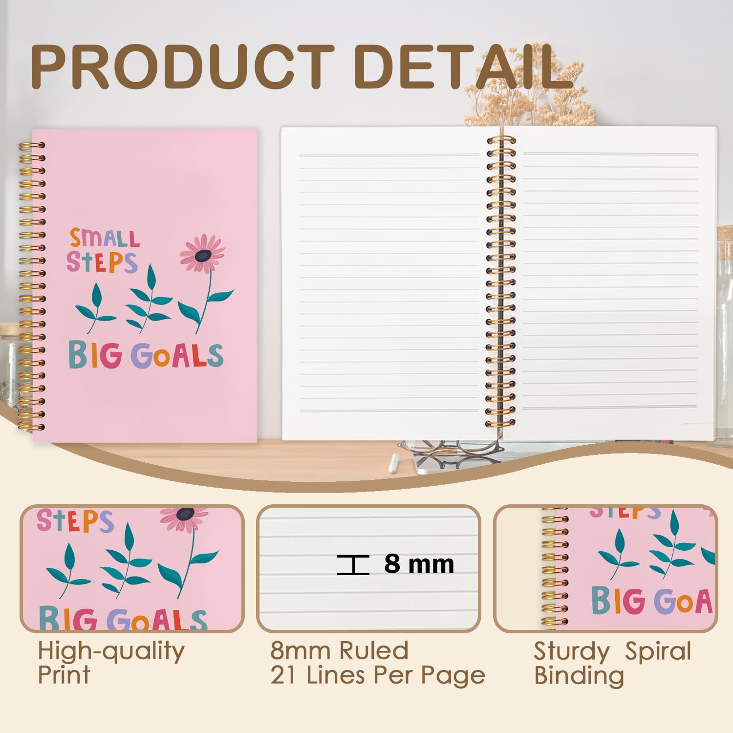 Pink Floral Inspirational Spiral Journal Notebook 5.5x8.3in, Small Steps Big Goals Mental Health Journal for Women, Motivational Notebooks for Note Taking, Pink Flower Hardcover Notebook