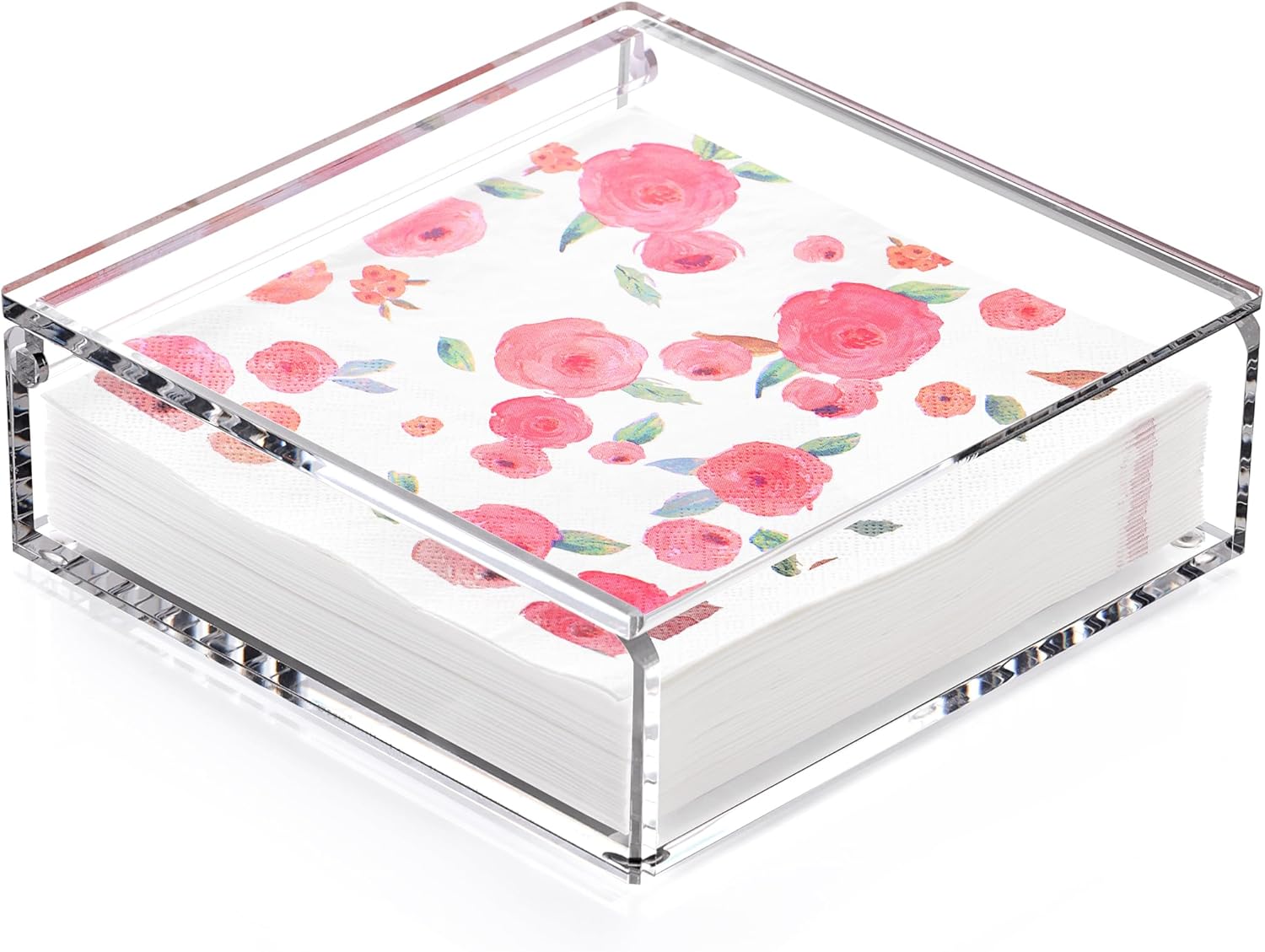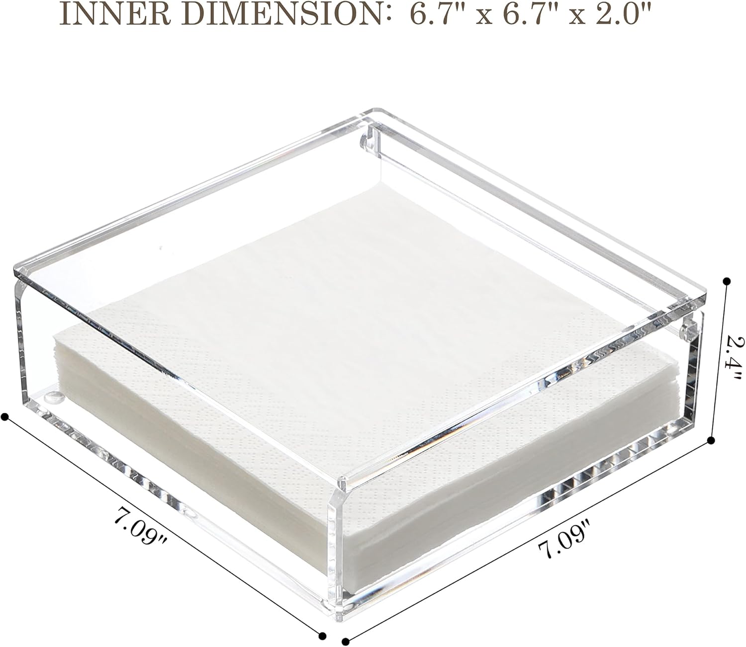 - 【Perfect Size for Standard Napkins】This acrylic napkin holder for table measures 7.09" x 7.09" x 2.4", designed to fit 6.5" x 6.5" luncheon napkins and other standard folded paper napkins.