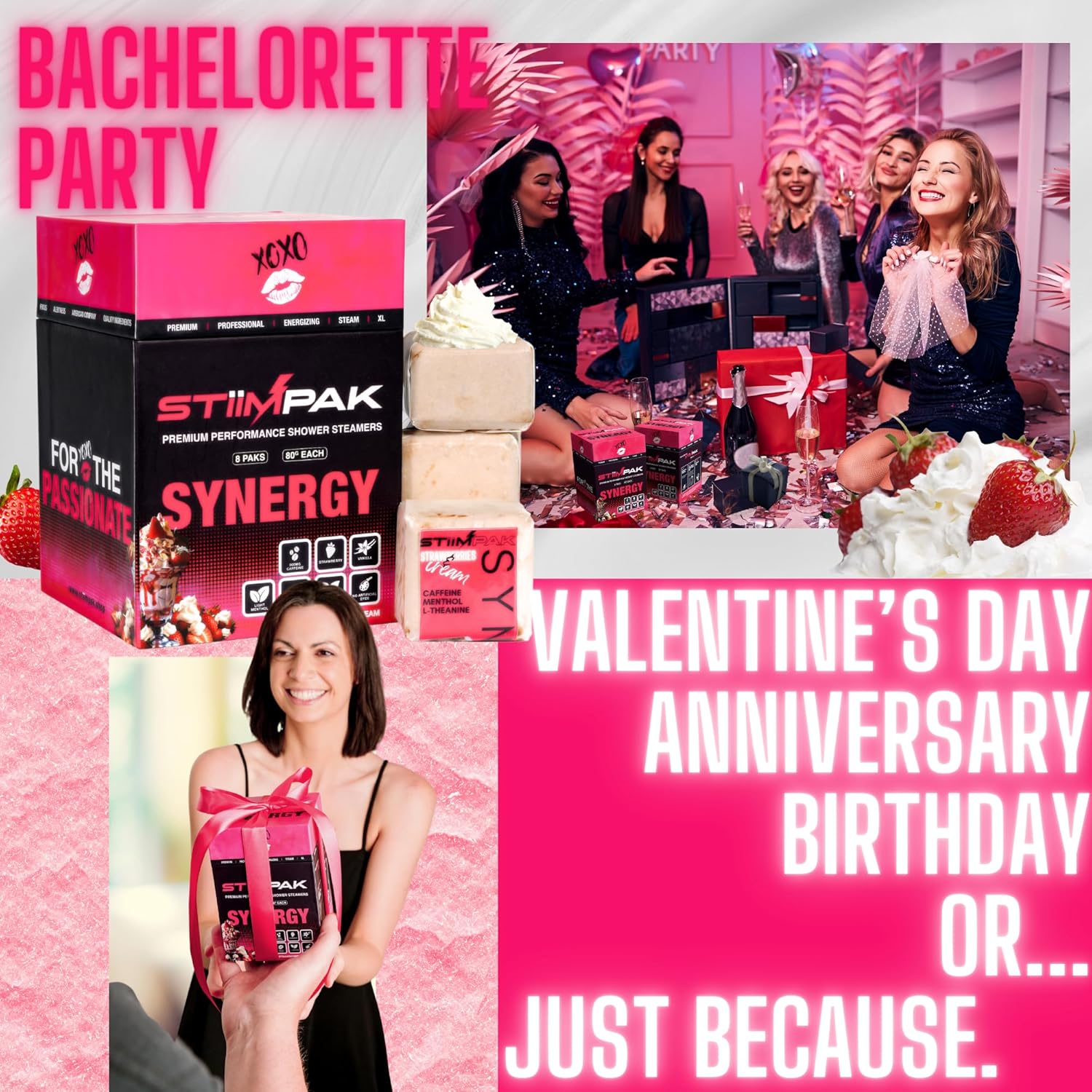 Shower Steamers | Synergy | XL 80g | Intimacy, Relaxation & Self-Love Aromatherapy | Caffeine, L-Theanine & Menthol | Gift for Women | Strawberry Vanilla | STiiMPAK (8 Pak + Loofah)