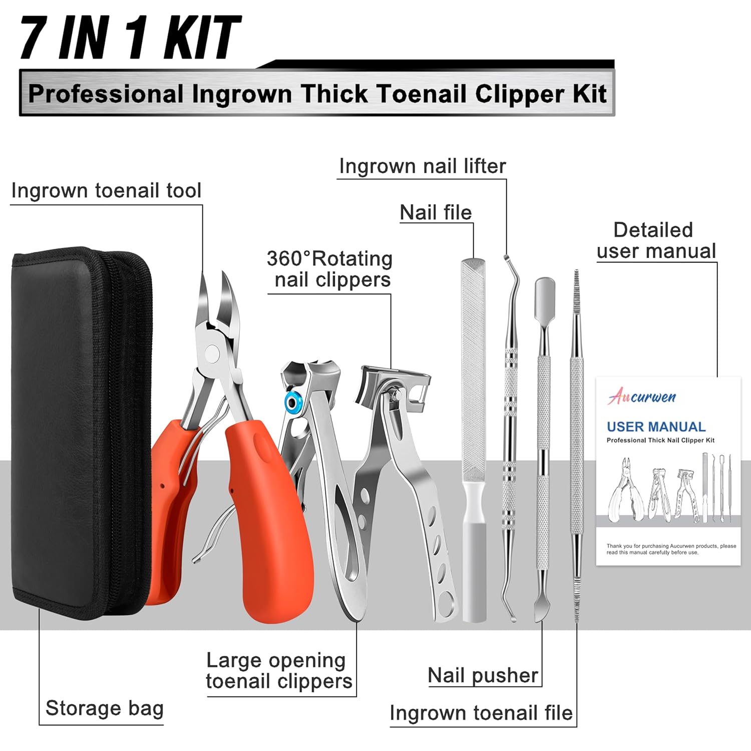 - 【What You Get】: 7 in 1 professional nail clippers, you will get 1× ingrown toenail tool + 1× large opening toenail clippers + 1× 360° rotating nail clipper + 1×ingrown toenail file + 1× ingrown nail lifter + 1× nail pusher + 1× nail file + 1× user manual + 1× storage bag, if you are not satisfied with the nail clippers, please contact us for a replacement, we will serve you whole-heartedly.