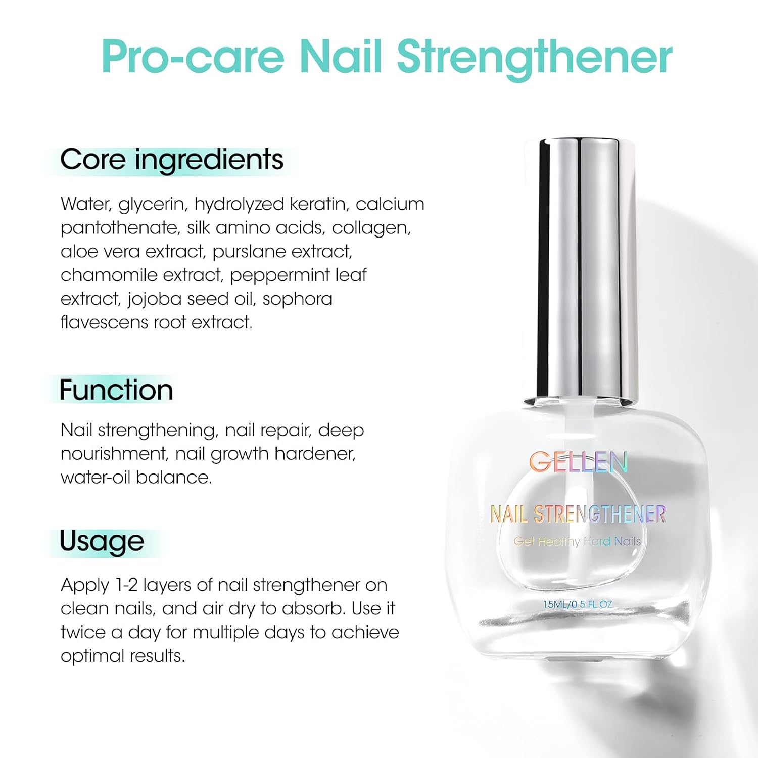 - Pro Care Nail Strengthener & Fragrance-free for Sensitive Nails: Gellen 8-in-1 Nail Strengthener is specifically formulated to strengthen damaged nails, repair soft and weak nails, promote nail growth, and provide nourishment. Added multiple nourishing extracts to support healthy nail growth from the roots. Itโs an excellent everyday nail care solution, especially for nail repair after gel polish removal.