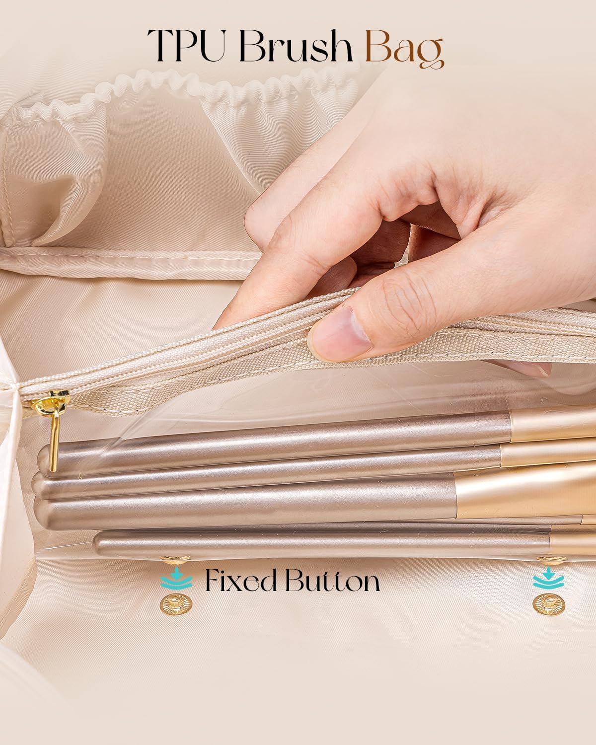- Versatile Compartment: 2 large compartments and 3 elastic pockets neatly organize your makeup, while the middle zippered TPU pocket is perfect for small items and jewelry. Extra portable pouch keeps your keep brushes neatly stored and visible