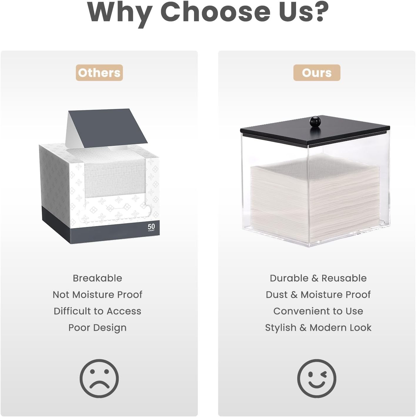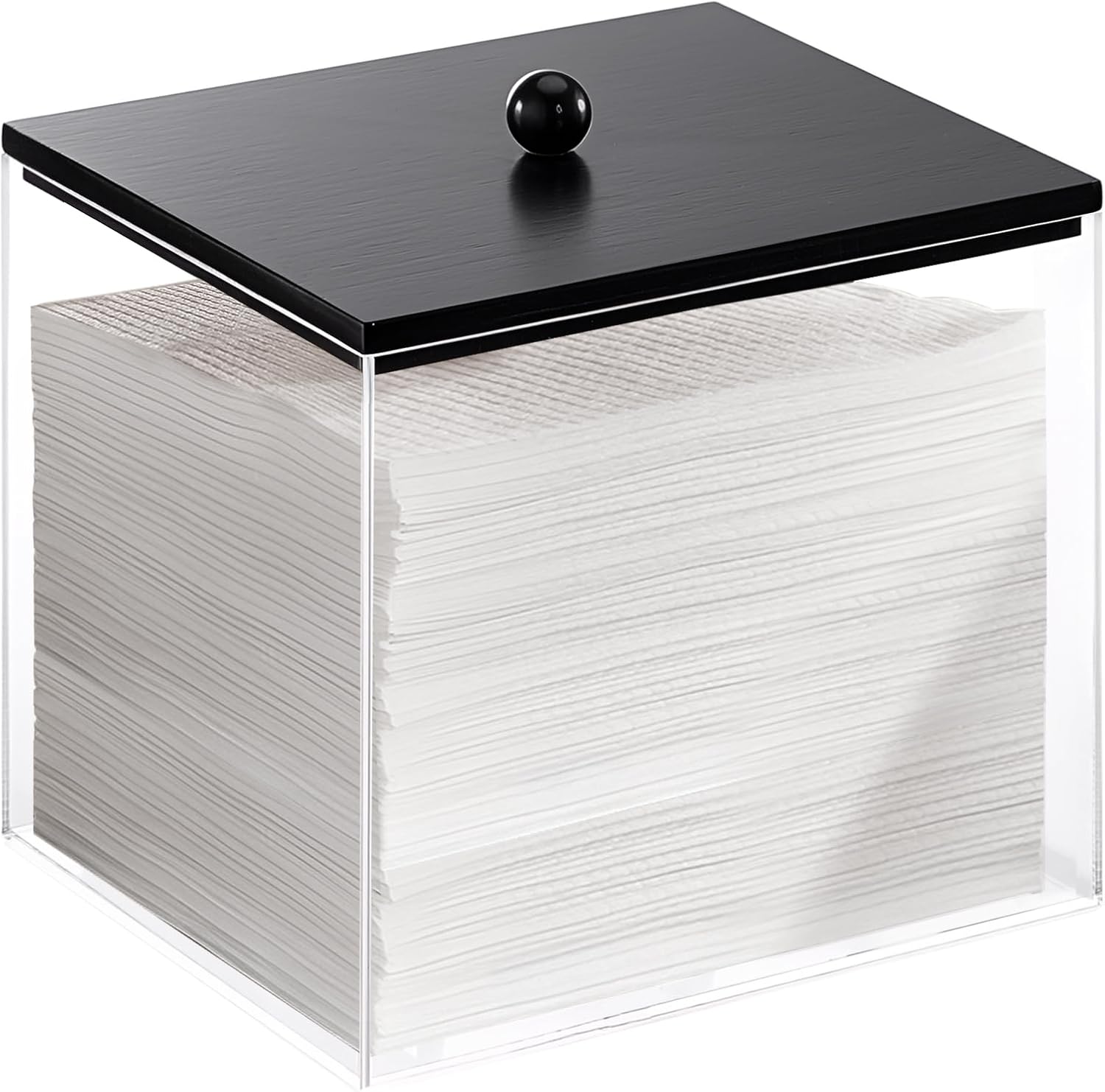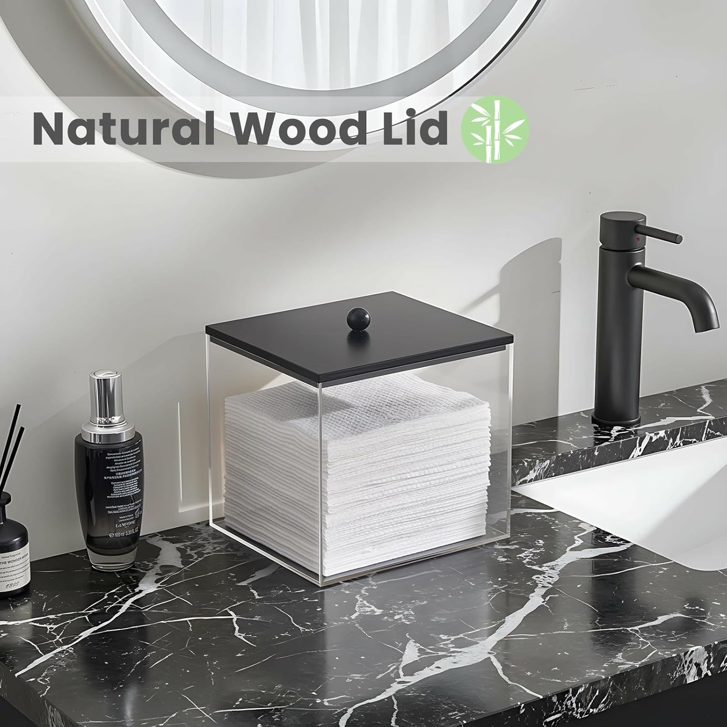 Puricon Acrylic Disposable Facial Towels Holder, Clear Storage Bin with Wood Lid Compatible with Clean Skin Club Towel (NOT Included), Face Towelettes Container for Bathroom Counter -Black