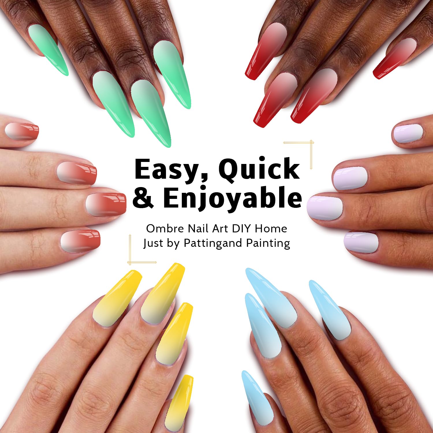 - 【HAVE FUN:】Karroy ombre nail gel will bring you great fun by self-coloring mixing, sponge-patting painting, brushes drawing & dotting, ect. It's easy, colorful, and wonderful! Package list: 9-Color Palette, 6PCS Nail Art Brushes, 1 Grabber, 100PCS Nail Sponges.