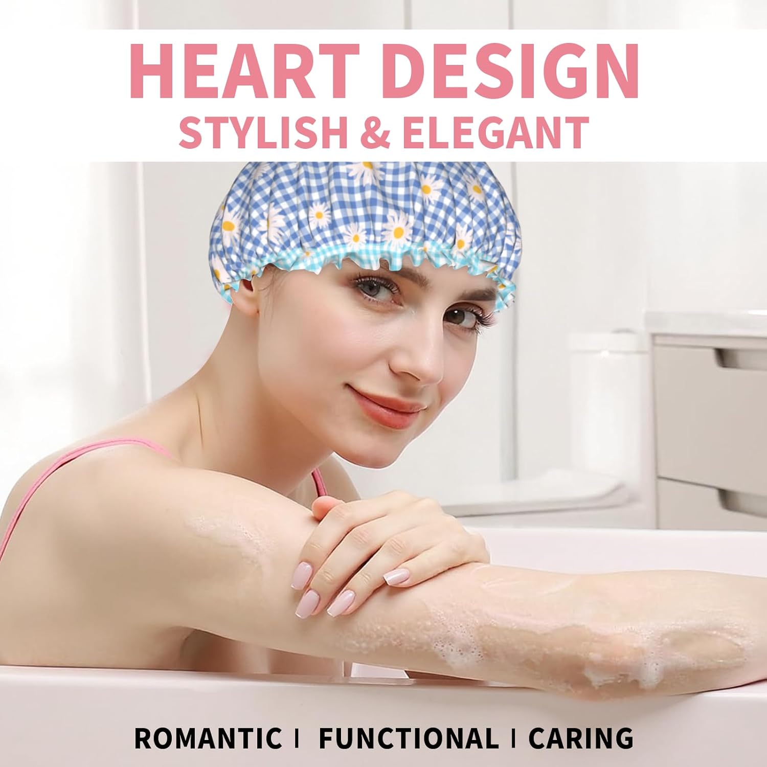 Blue Checkered Shower Caps for Women Daisy Flower Double Waterproof Layers Bath Hat Elastic Reusable Hair Cap for Shower Cooking Clean Makeup