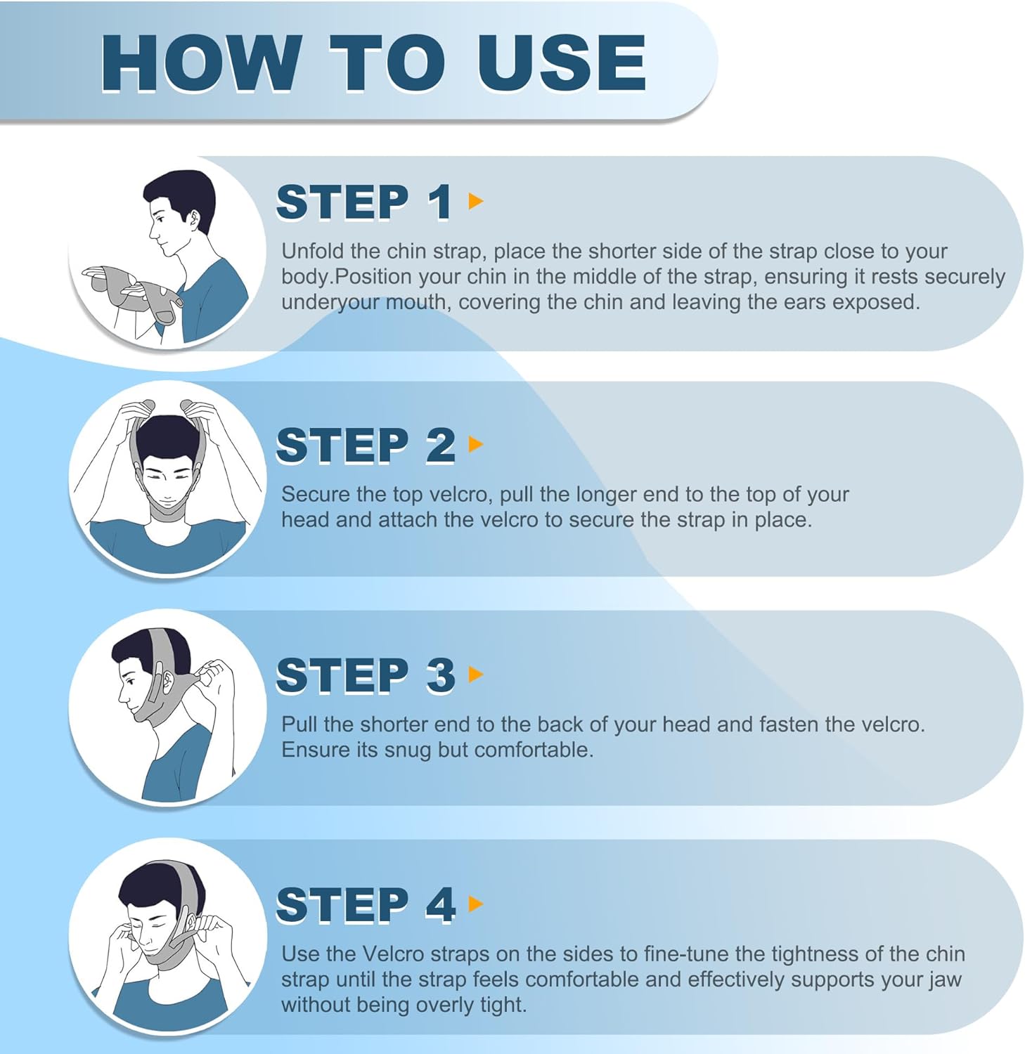 - Easy to Use: The ergonomic design of the anti-snoring chin strap makes it easy to put on and adjust. Simply place your chin in the center, take the longer end of the strap and pull it over your head to secure the top touch fastener. Then, pull the shorter end behind your head and secure the touch fastener at the back. Adjust the touch fastener on the left and right sides to your demonds for tightness. The whole wearing process takes only a few seconds for effortless nightly use