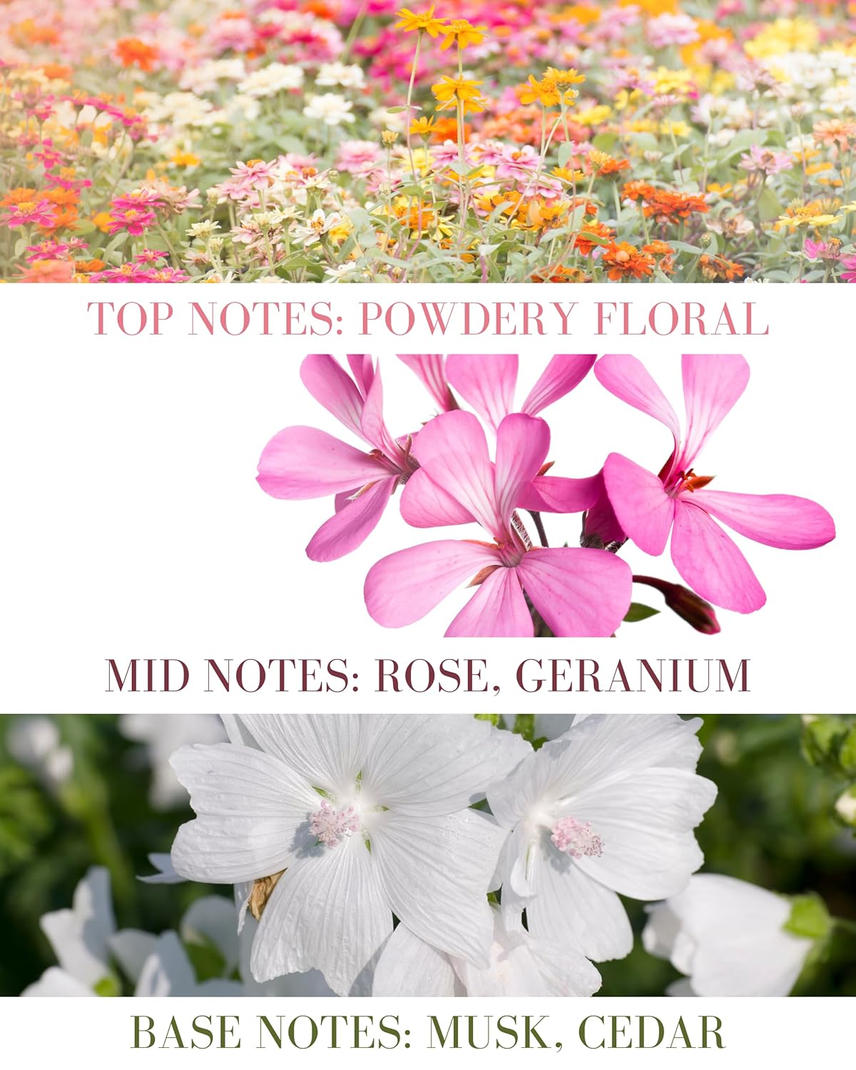 - SCENT PROFILE - Top: Powdery floral Mid: Rose, Geranium Base: Musk, Cedar. Not quite the scent of a newborn’s head, but maybe the next best thing. Powdery floral notes of rose, geranium, ylang ylang and patchouli with just a dust of cedarwood and musk.