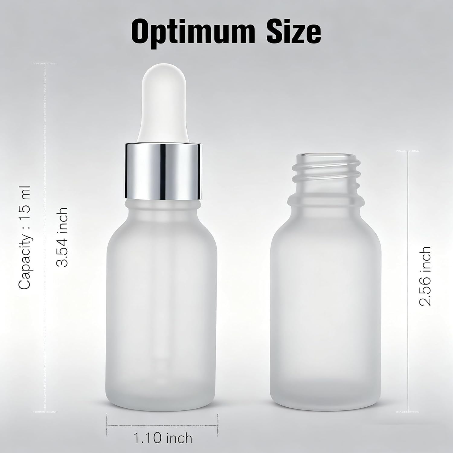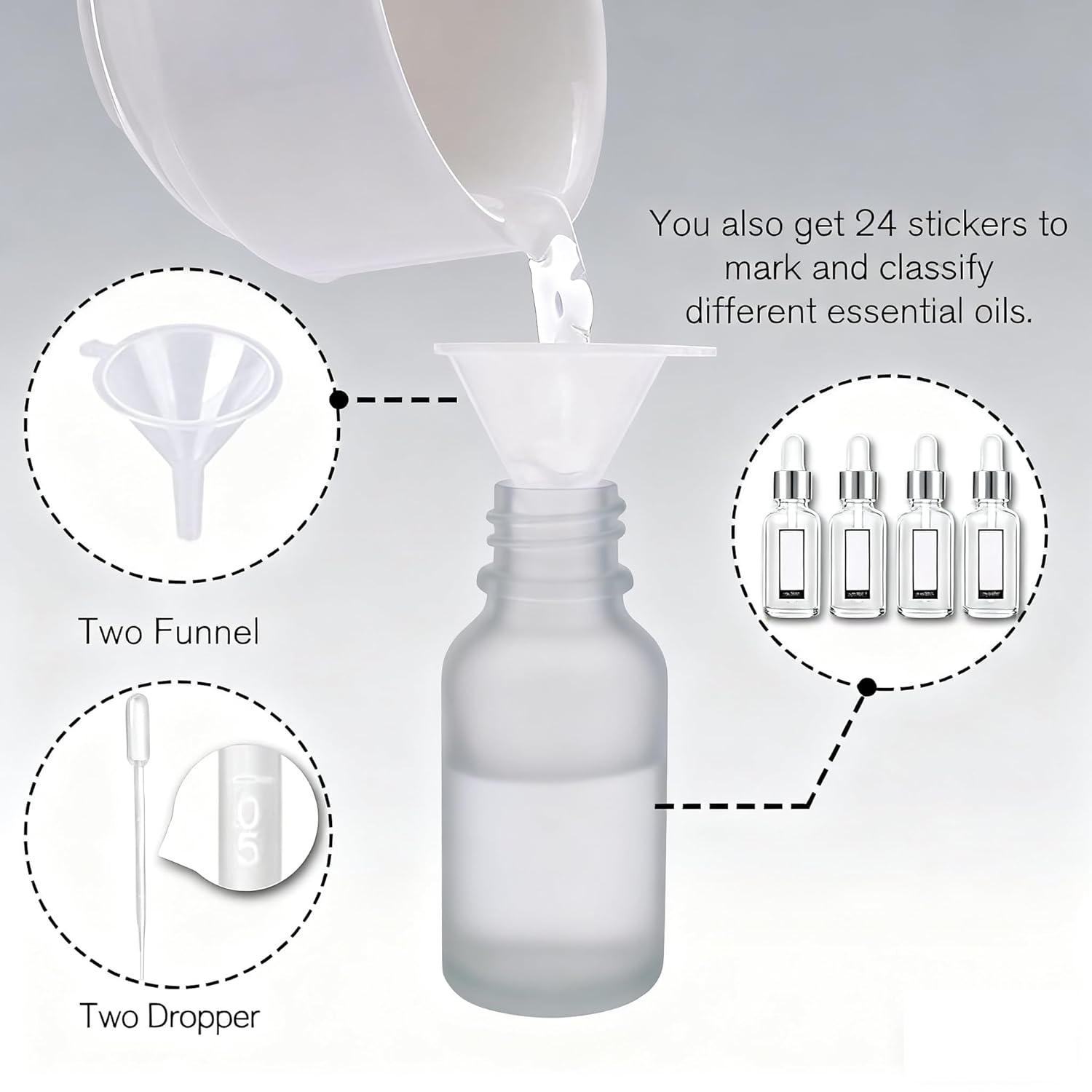 PrettyCare 24 pcs,Eye Dropper Bottle 0.5 oz( 15 ml Frosted Glass Bottles with Silver Caps, 2 Extra Measured Pipettes, 48 Labels, 2 Funnels Empty Tincture Bottles for Essential Oils