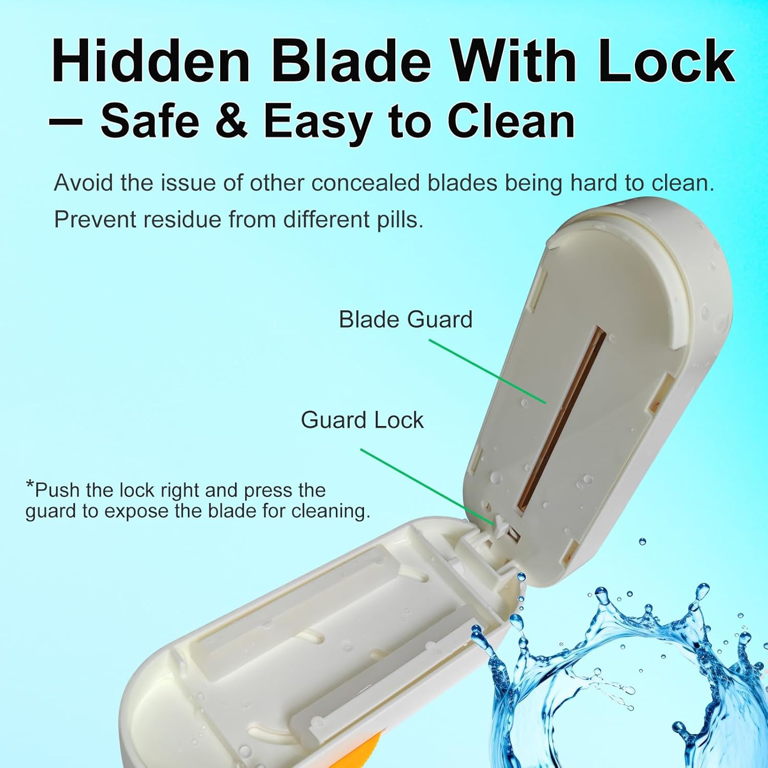 - Easy to Clean: The sharp blade is hidden with a guard lock.Simply push the lock right and press guard board to expose the blade for cleaning. The brush helps you collect pills and clean the pill cutter easily. The body is made from food grade plastics. The medicine pill cutter is exquisitely made. It is a good helper for cutting pills for the elderly, kids and pets