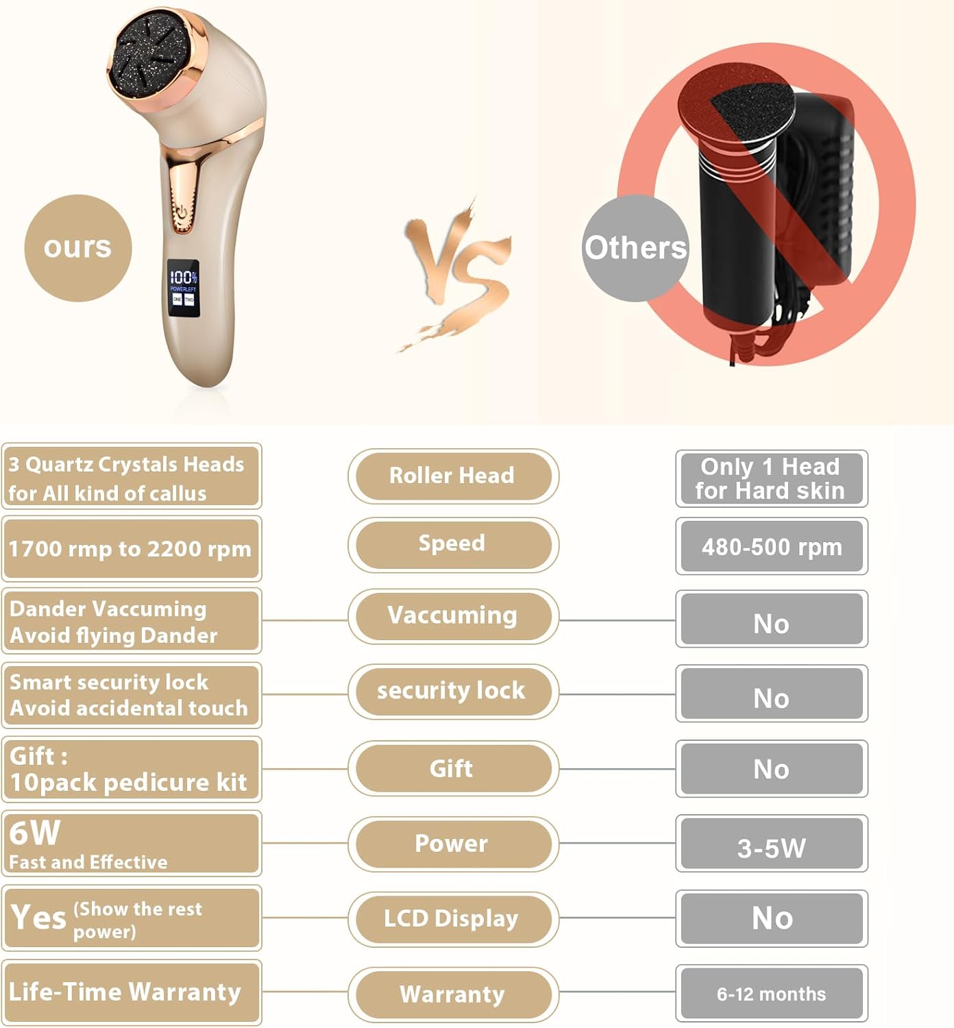- Pedicure kit with 9 Grinding Head, 2 Speed, with VACUUM ABSORPTION----- 9 Quartz Crystals Removable Roller Heads and 2 Speed Correspond to the roughness required to remove the calluses on the feet. UPGRADE powerful callus remover with dander vacuum cleaner quickly sucks away foot scraps, cle.an and hygienic, and sucks while grinding. dust-free, and foot scraps will not be scattered in air or floor, an essential home pedicure kit for people who has cleanliness.
