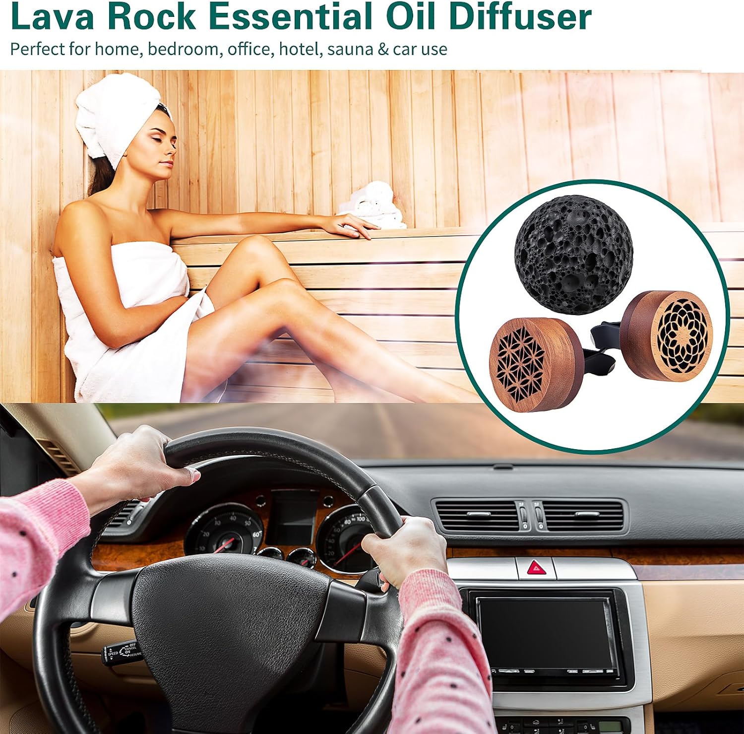 3 Pcs Lava Rock Essential Oil Diffusers -1 Spherical Lava Stone Passive Diffuser and 2 Wooden Car Diffusers for Essential Oils, Passive Diffuser for Sauna Room, Home, Office, Bedroom, Bathroom, Car
