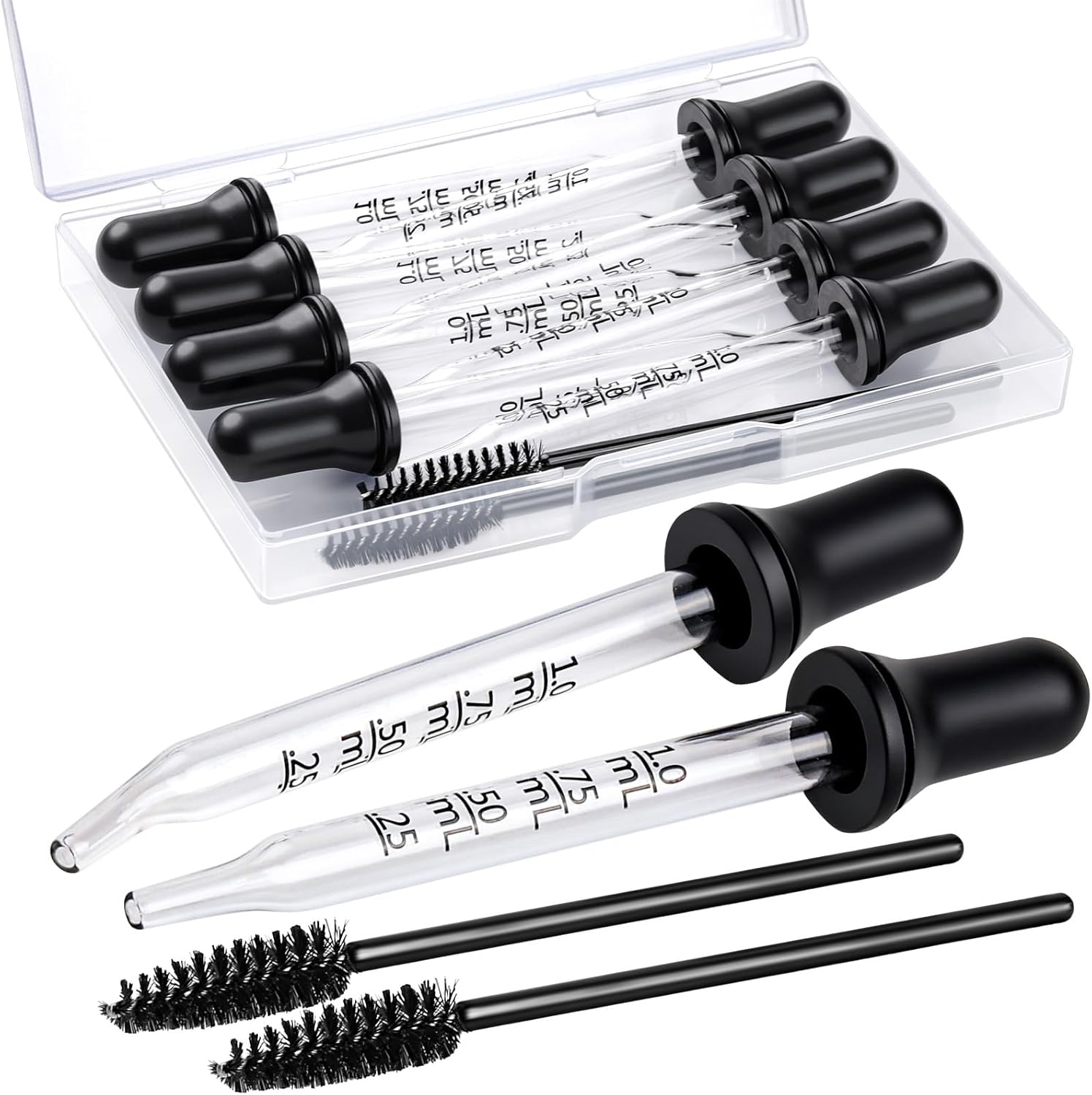 - Eye Dropper with Cleaning Tools: come with 8pcs 1ml galss droppers and 2pcs brushes for dropper and a nice contaniter. 10pcs in total, and there are 4* straight and 4* bent tip glass dropper. Droppers and cleaning tool set can better meet your needs. The nice box to help you better organize and carry eye droppers