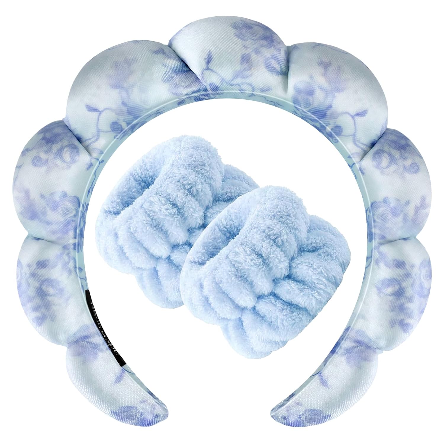 - SPA HEADBAND and WRISTBAND MATERIAL: Patent No.: US D1018980 S. Spa headband and wristband set is the perfect solution.Bubble Spa headband for women the sponge lining used and the velvet fabric covering the surface. These face wash headband have a grwm water absorption function and can be used when you are washing your face, skincare or makeup. The wristbands are made of quality coral fleece.And wristbands also have good elasticity, can be stretched to fit your wrist better