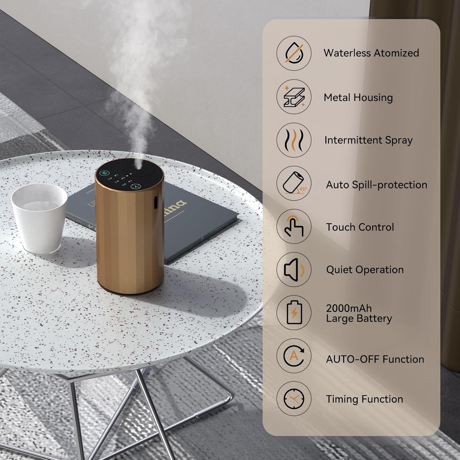 Waterless Essential Oil Diffuser Aromatherapy Scent Diffusers for Home Large Room, Bedroom, Car, Office, Desk, Battery Operated Mini Portable Air Freshener (Golden)