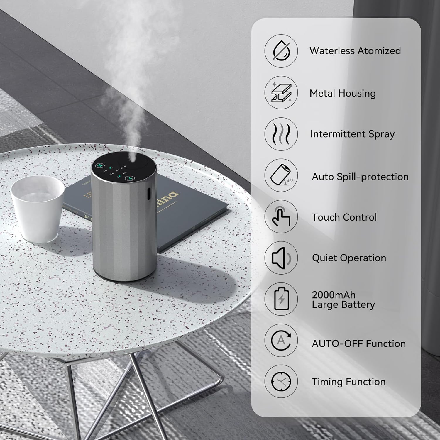 Waterless Essential Oil Diffuser Aromatherapy Scent Diffusers for Home Large Room, Bedroom, Car, Office, Desk, Battery Operated Mini Portable Air Freshener (Silvery)