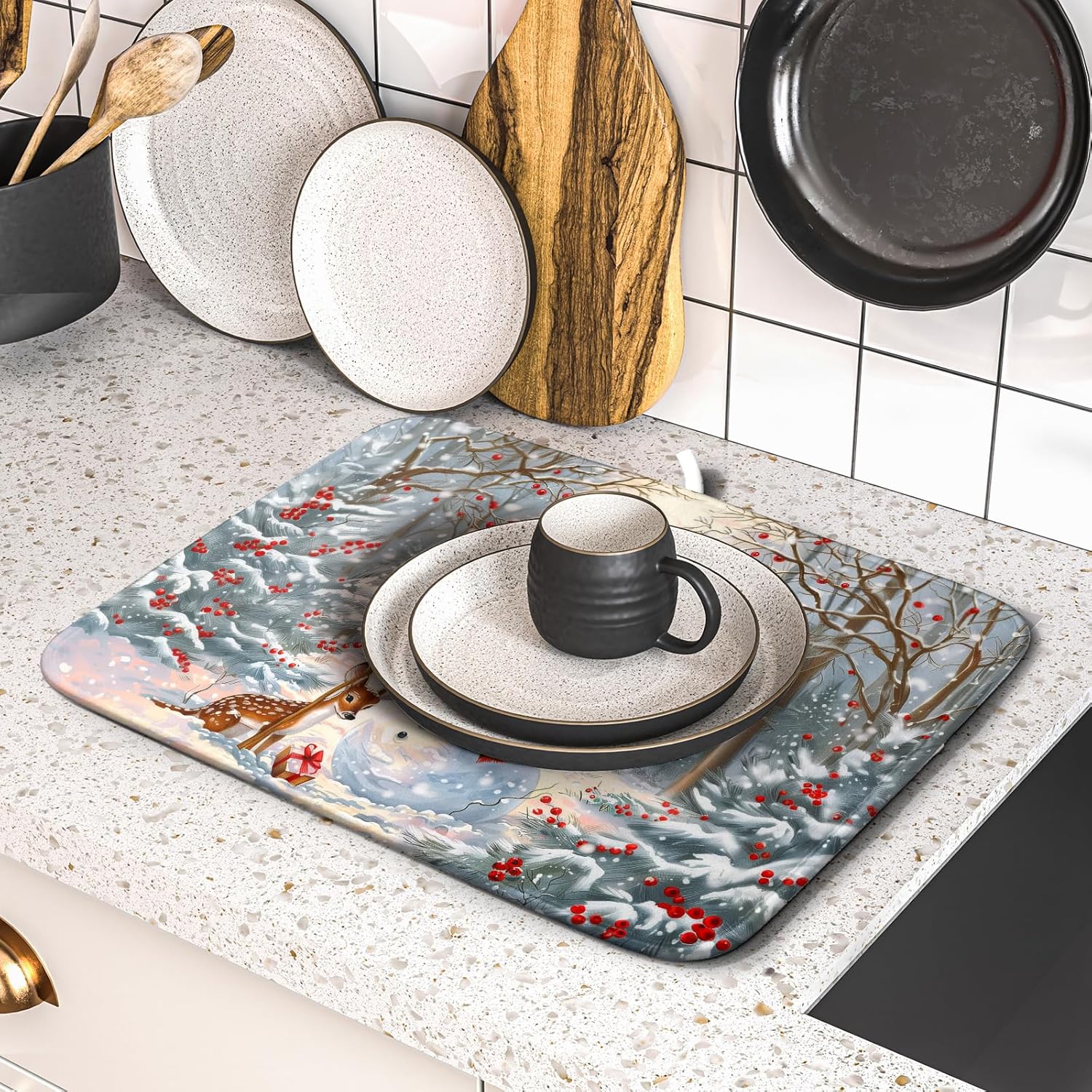 - 【Protect Tableware】Place your dishes on it or under dish racks, the Christmas snowman dish mat prevents bowls, glassware, and more tablewares from being scratched or worn, can be used as dish drying mat, sink mat, dishes drainer mats to keep the countertop dry and tidy.