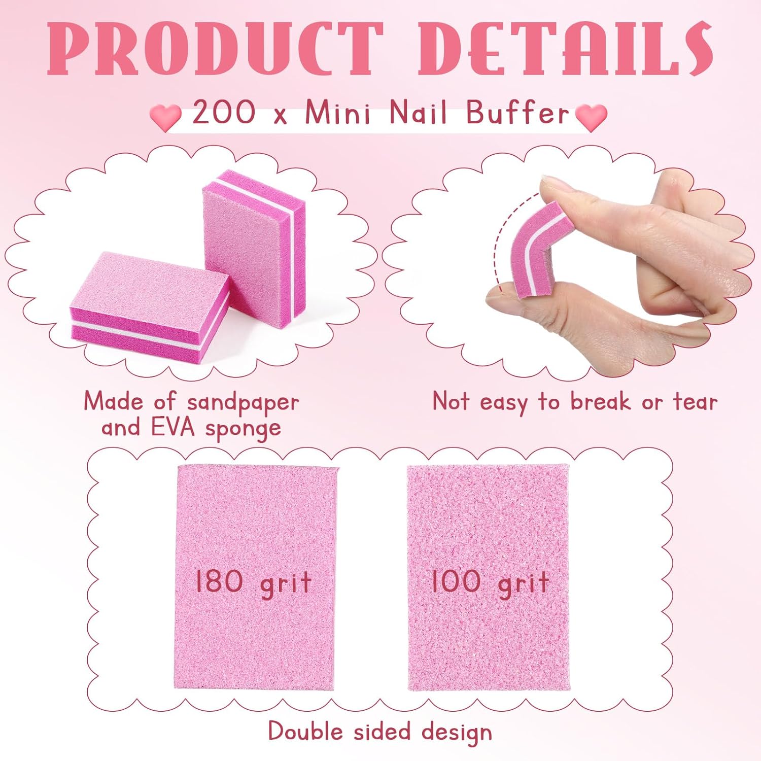 200 Pcs Mini Nail Buffer Blocks Bulk Sponge Double Sided Buffing Sanding Block Manicure Tools Bulk Nail File for Acrylic Nails and Natural Nails(100/180,Pink)