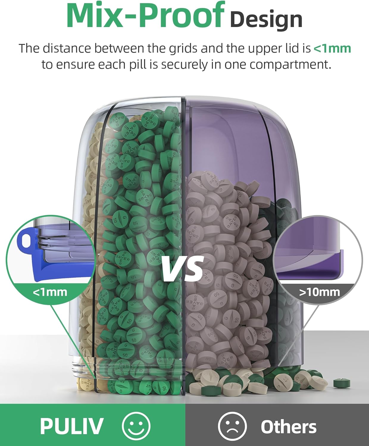 - Say Goodbye to Mixing Pills: PULIV jumbo medication organizer with the design that the distance between the grids and the upper lid is close to ensure anti-mixing pills. Stop being troubled by pills mixing when pouring. Please note: This organizer is not suitable for storing gummy vitamins. For optimal use, store in a dry place and avoid direct sunlight exposure