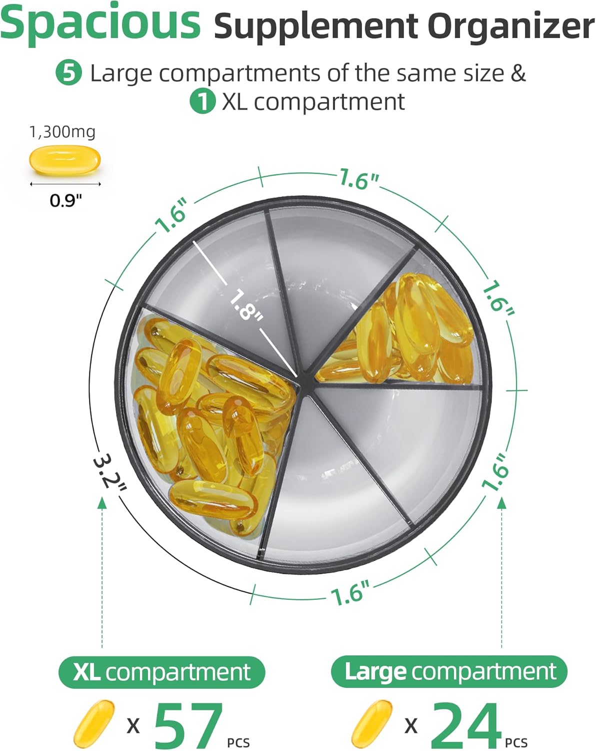 - Large Compartments: The PULIV pill holder weighs 6.5 ounces and features 1 XL compartment and 5 large compartments. The XL compartment can hold up to 57 fish oils, with each fish oil measuring 0.9" in length, while each of the large compartments can store 24 fish oils. This pill dispenser offers a convenient way to store 6 types of pills in one place. It has a height of 5.0" with a lid diameter of 3.6" and a base diameter of 3.0". And 20 stick-on labels can help differentiate each compartment